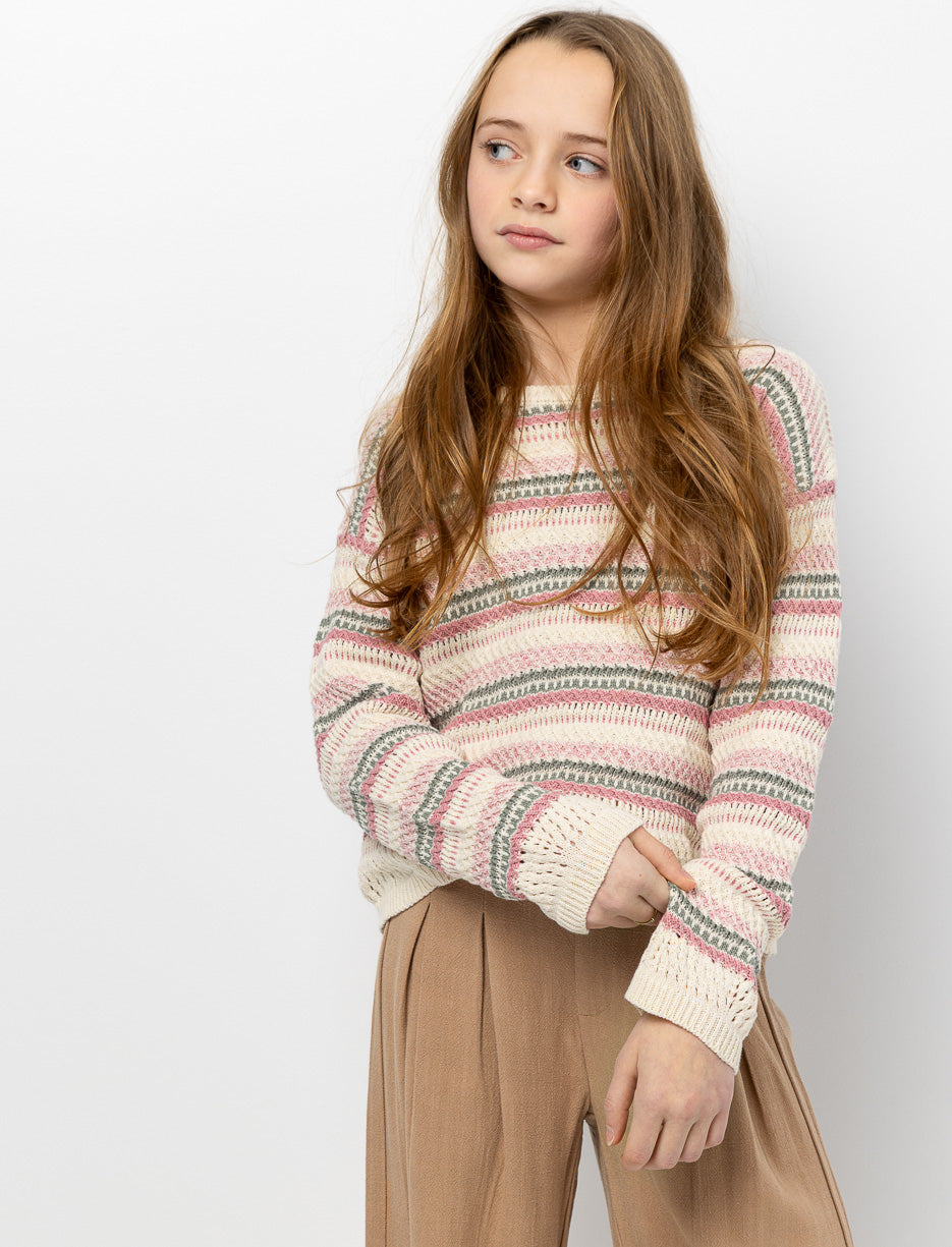 Ce chandail en tricot à rayures est conçu pour les ados qui cherchent un look tendance et confortable. Les rayures classiques offrent une allure intemporelle facile à combiner avec n'importe quel jean ou pantalon. La coupe moderne épouse délicatement la silhouette sans être trop ajustée, permettant une liberté de mouvement parfaite pour l'école, les sorties entre amies ou les moments détente. Un basique indispensable que ta fille adorera porter encore et encore.