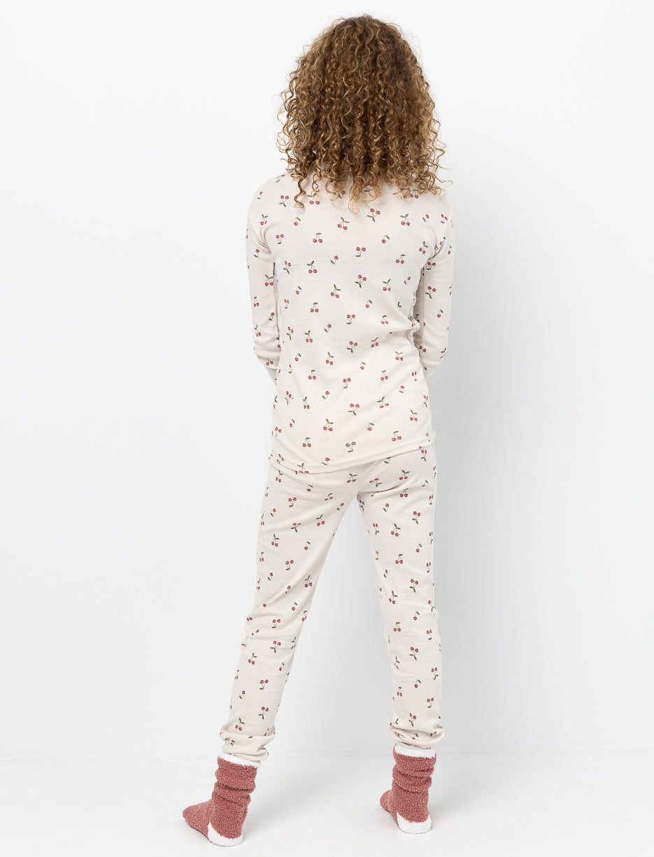 Offrez à votre enfant des nuits confortables avec ce pyjama 2 pièces à imprimé cerises, doté de poignets et chevilles côtelés, accompagné de bas doux pour un ensemble douillet.