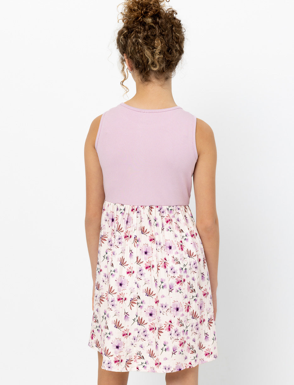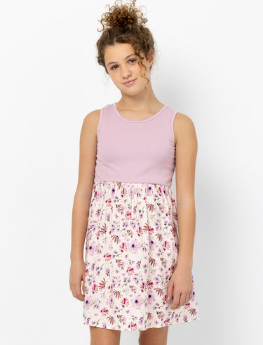 Cette robe sans manches allie élégance et fantaisie! Haut uni épuré, bas orné de fleurs colorées, coupe cintrée à la taille qui s'évase joliment. Col rond classique. Le choix parfait pour une ado qui aime mélanger style et amusement!