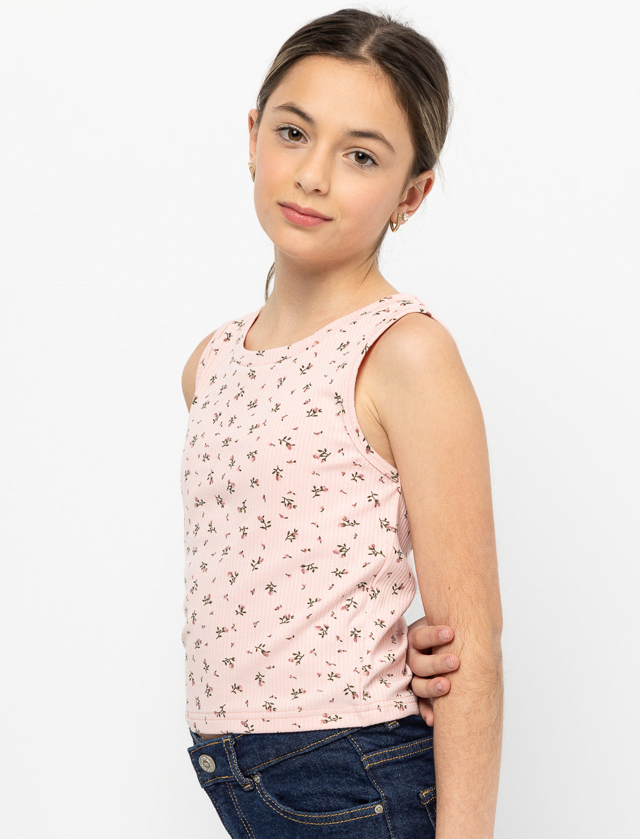 Camisole tendance pour jeune fille avec un adorable col rond et un motif floral qui couvre toute la pièce. Parfait pour ajouter une touche de couleur et de style à sa garde-robe estivale!