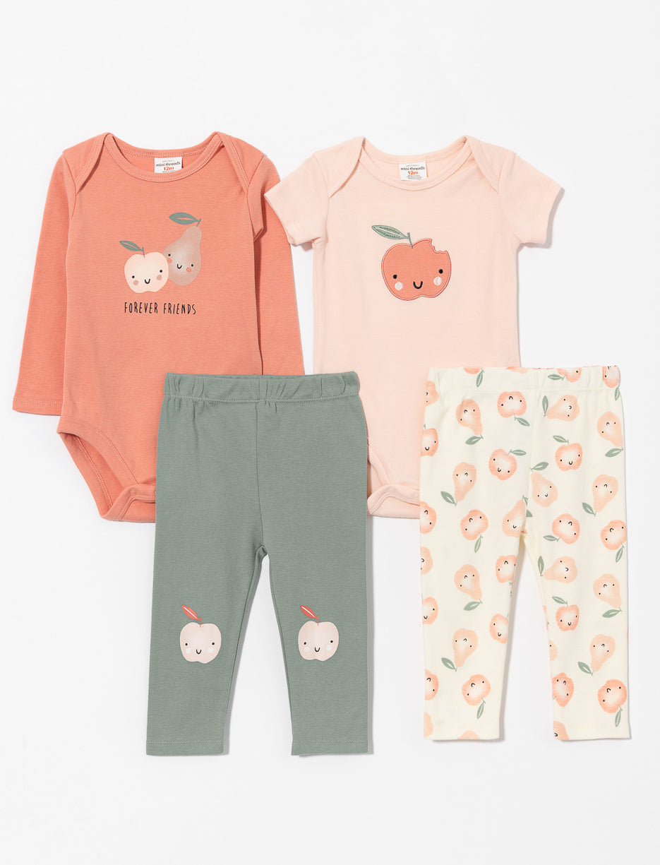 Envelopper bébé de douceur avec cet ensemble 4 pièces tout en confort. Deux cache-couches et deux pantalons ornés de charmants motifs fruités pour des tenues adorables et pratiques, parfaites au quotidien.