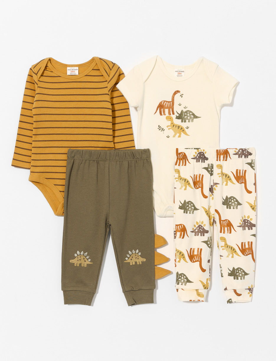 Craquant et pratique, cet ensemble 4 pièces accompagne bébé dans toutes ses aventures ! Avec ses motifs dinosaures et ses tissus doux, il assure confort et style à chaque mouvement.