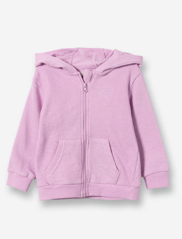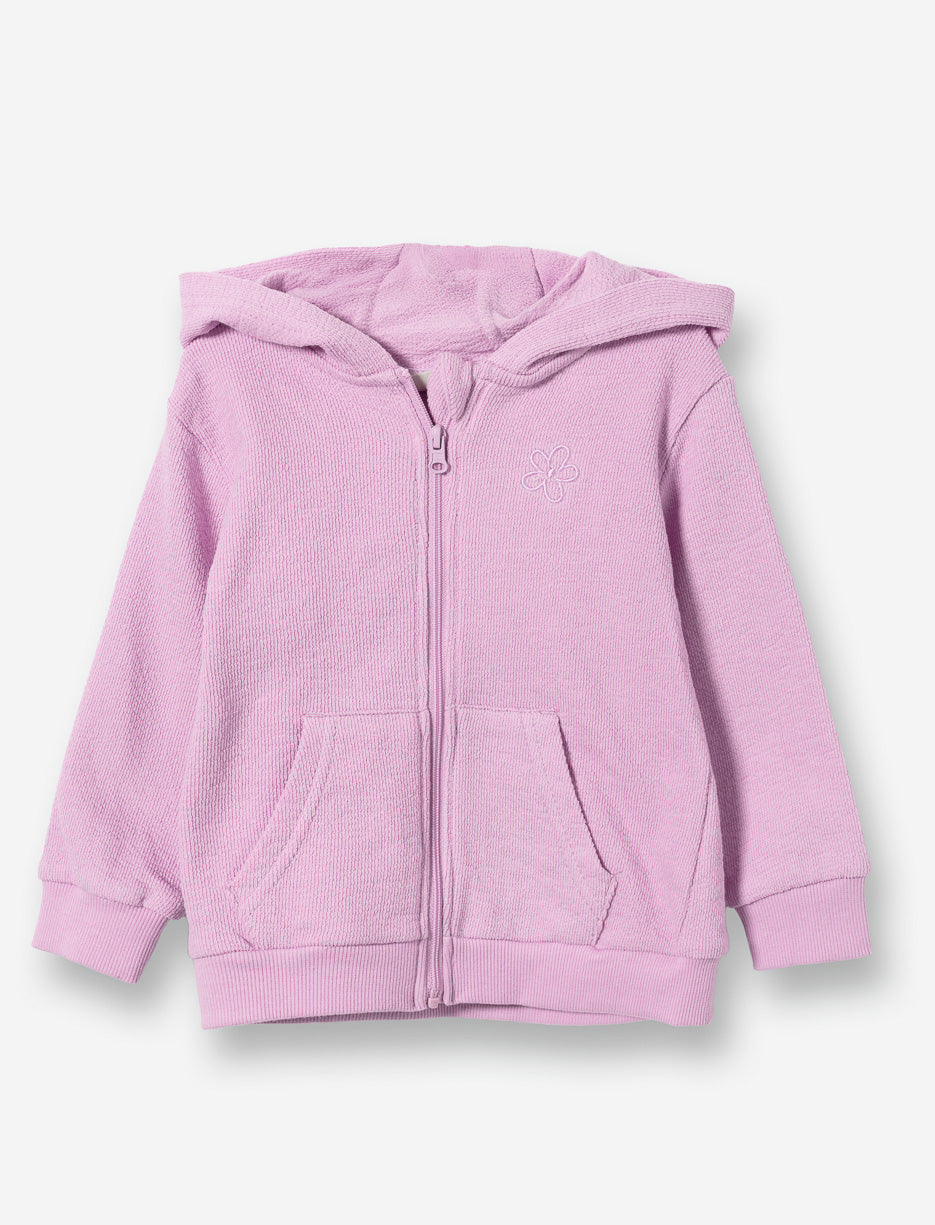 Cardigan à capuchon en terry super confo avec zip complet, deux poches et finitions côtelées. Parfait pour les jours où elle veut se sentir bien dans ta peau!