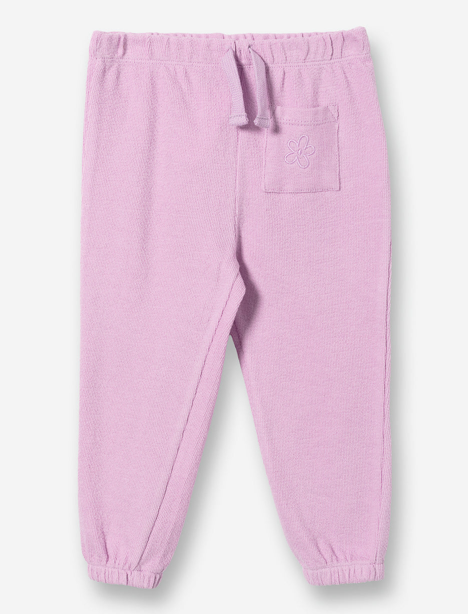 Confortable et mignon! Ce pantalon ouaté pour bébé fille offre une taille élastique avec cordon pour un ajustement parfait. Confectionné en terry doux, il arbore un design uni avec poche et élastiques aux chevilles. Idéal pour les jours de détente!