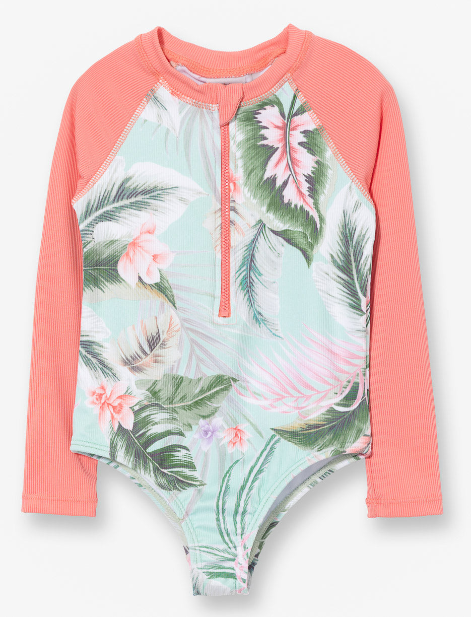 Ce maillot 1 pièce offre confort et protection grâce à ses manches raglan unies et son demi-zip pratique. Son corps imprimé et son tissu UV50 en tricot côtelé en font un choix parfait pour jouer au soleil avec style.