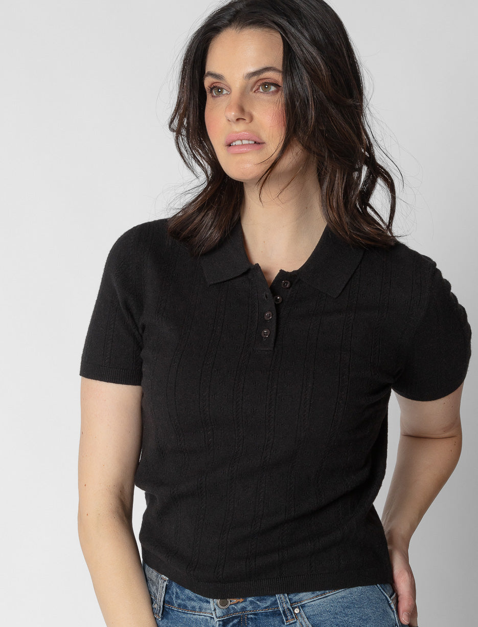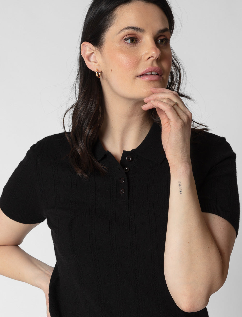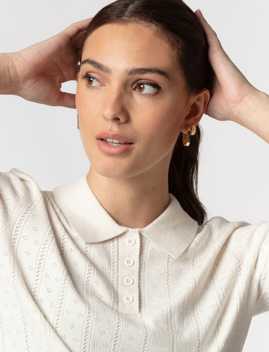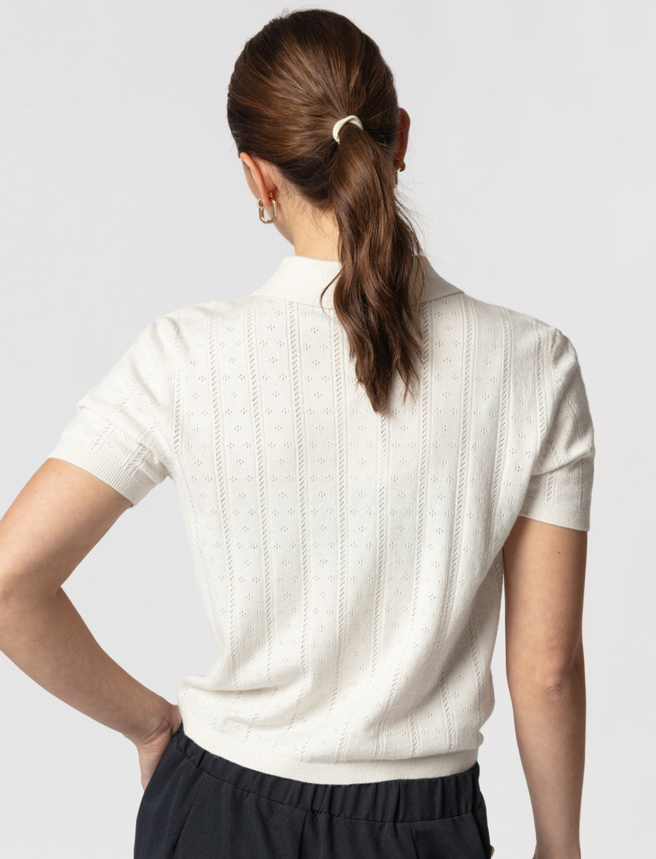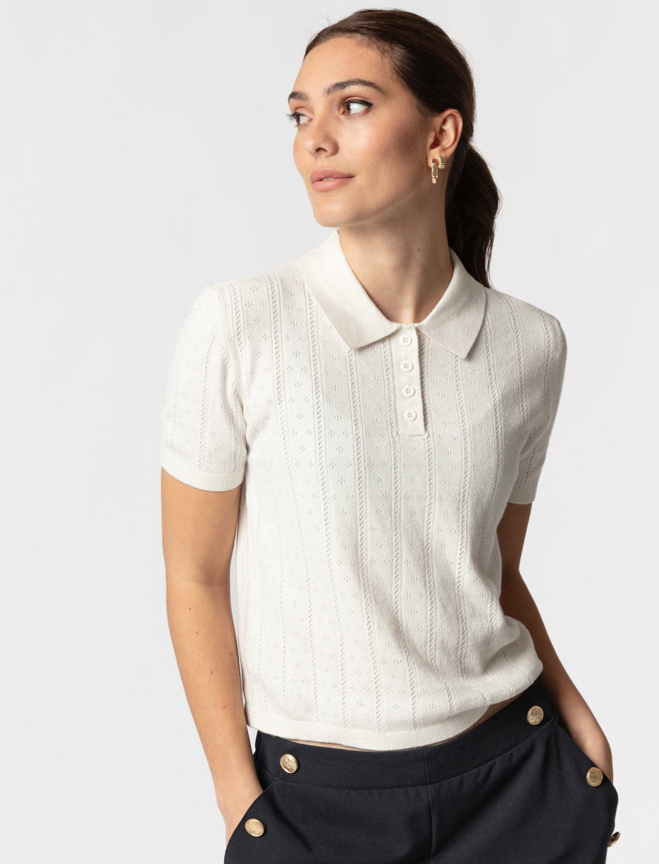 Ce polo en pointelle revisite un classique avec une touche de féminité et d’élégance. Son col et ses boutons délicats lui donnent un charme intemporel. À porter avec un pantalon chic ou une jupe fluide pour une allure à la fois moderne et raffinée.