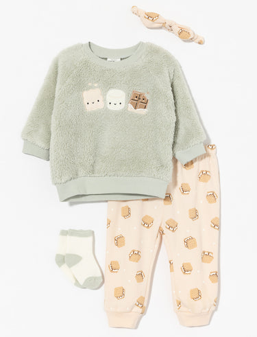 Un ensemble 2 pièces craquant pour les petites gourmandes avec chandail en peluche brodé, pantalon imprimé, bandeau assorti et chaussettes coordonnées. Confort et style réunis pour des journées douces et ludiques.