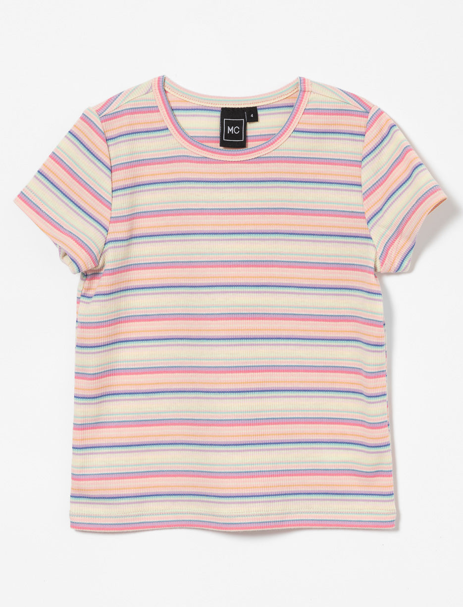 Un essentiel coloré pour les journées ensoleillées ! Ce t-shirt à rayures multicolores en tricot côtelé combine douceur et extensibilité pour un confort optimal du matin au soir.