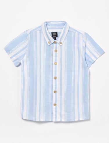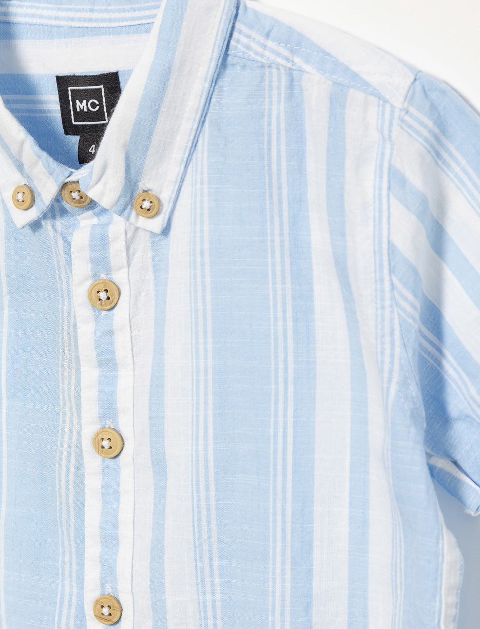 Chemise à effet lin pour petit garçon, à manches courtes, col chemisier et fermeture à boutons. Motif à rayures sur l’ensemble pour un style décontracté.