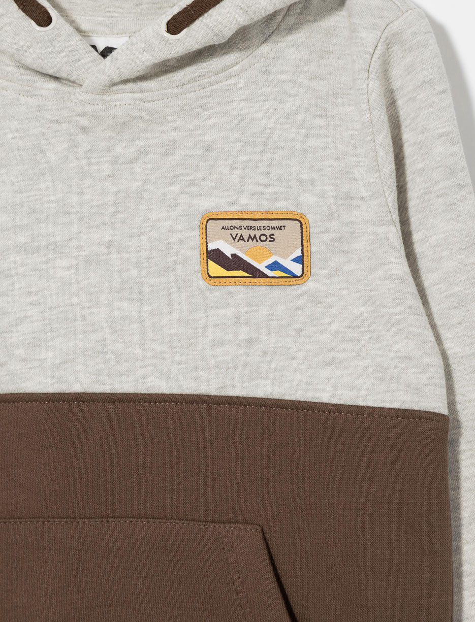 Chandail ouaté à blocs de couleur pour petit garçon, doté d'une poche kangourou, d’un badge à la poitrine et de finitions côtelées aux extrémités. Parfait pour les moments de fraîcheur et de confort.