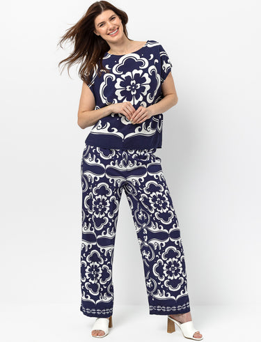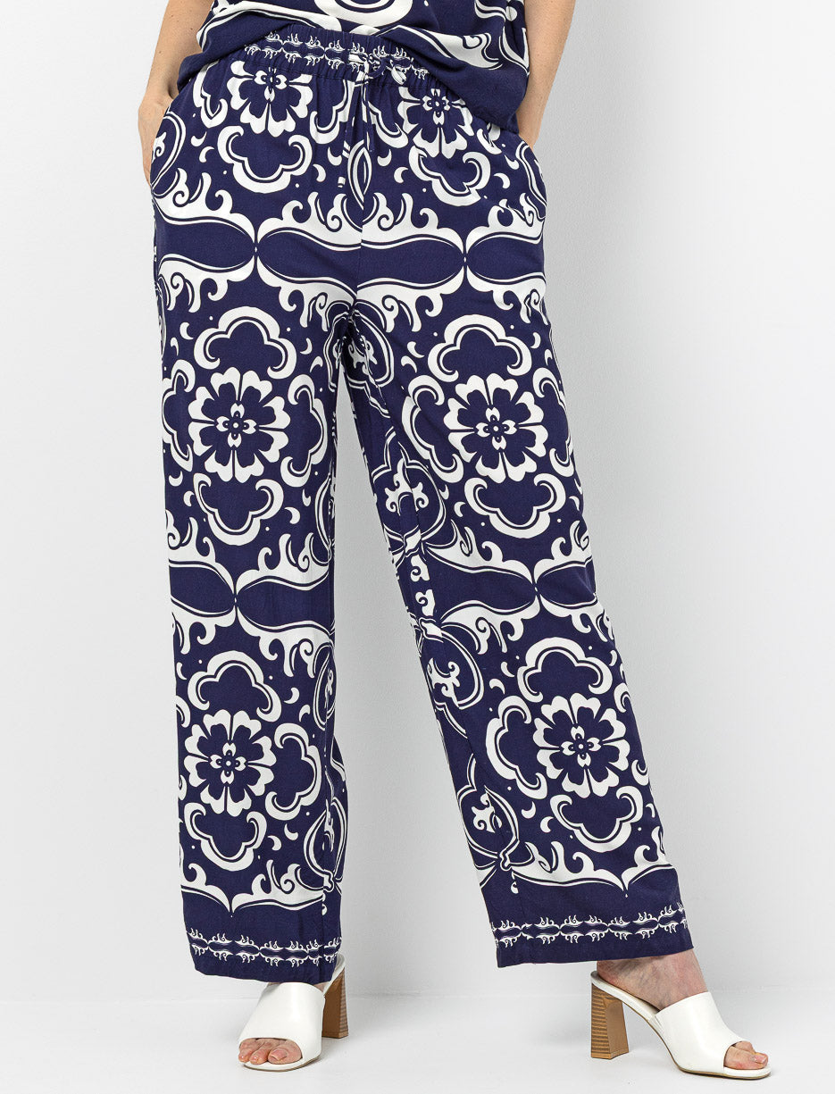 Pantalon femme aux jambes larges en challis imprimé. Taille élastique avec cordon de serrage pour un ajustement parfait. Confortable et élégant, il épouse votre silhouette tout en offrant la liberté de mouvement que vous méritez.