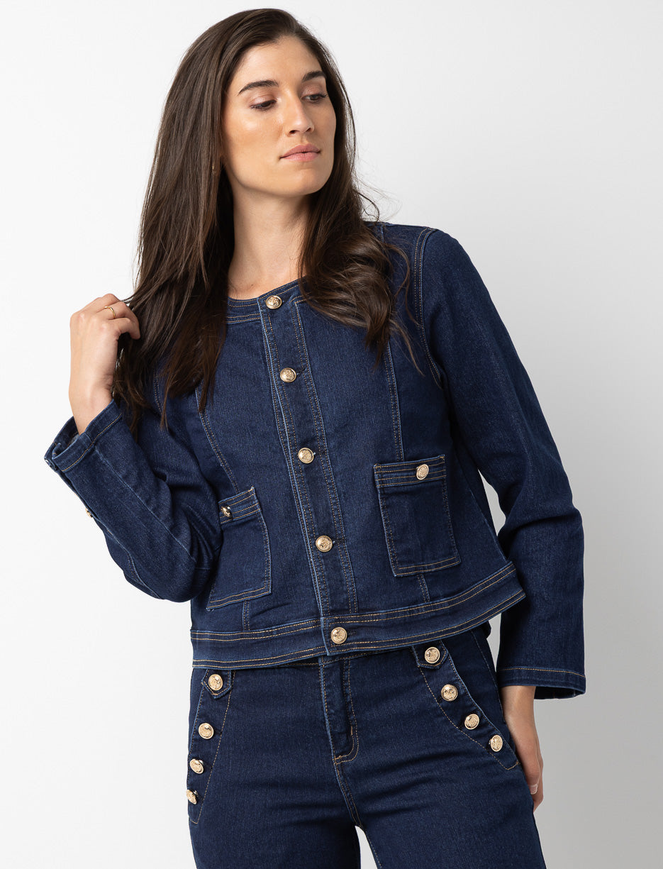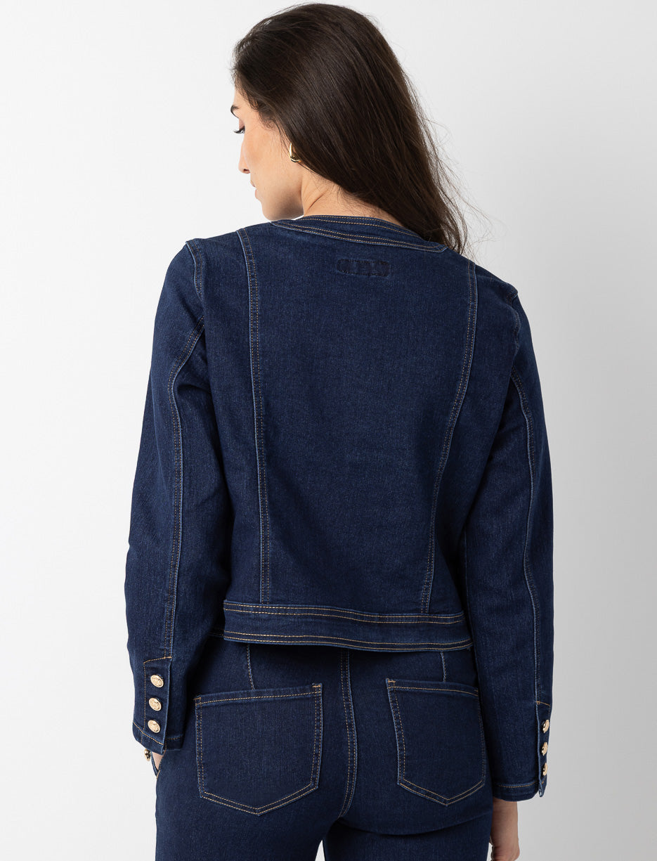 Avec ses coutures contrastantes et ses boutons dorés, cette veste courte ajoute une touche raffinée à n’importe quelle tenue. Parfaite pour structurer une tenue avec élégance et simplicité.