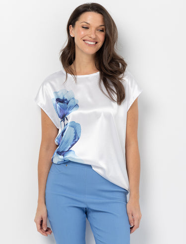 T-shirt satiné à manches dolman et col rond. Son élégant imprimé floral bleu sur fond blanc apporte une touche de fraîcheur et de féminité à votre garde-robe.