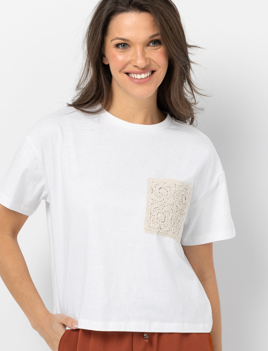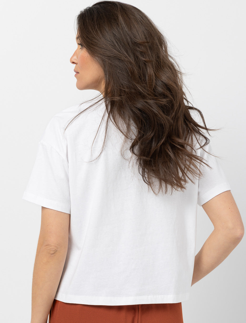 T-shirt boxy épuré pour femme avec manches courtes et épaules détendues. Son col rond intemporel et sa poche poitrine contrastante ajoutent du style. Confortable et polyvalent, c'est le basique parfait pour tous vos looks du quotidien.