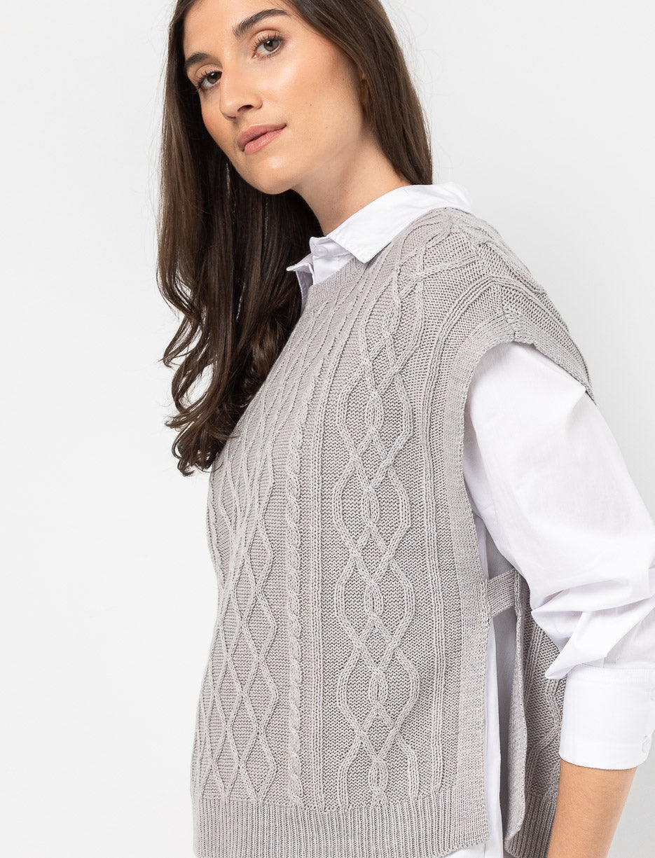 Un tricot sans manches au look moderne, travaillé de motifs torsadés et doté de côtés ouverts pour une superposition facile et tendance.