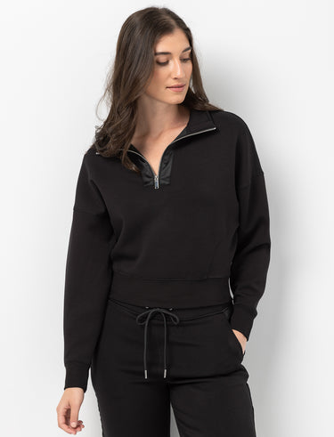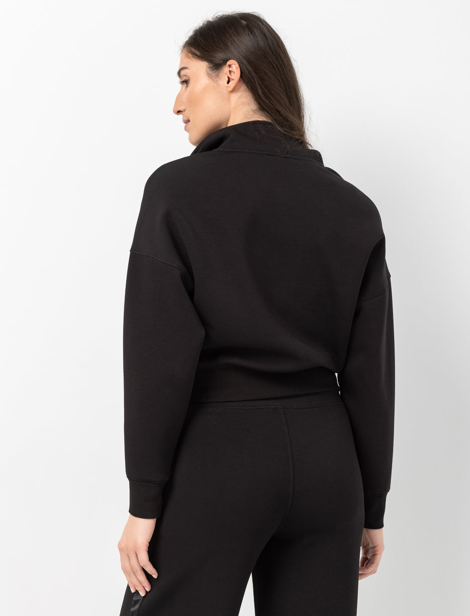 Ajoutez du style et du confort à votre quotidien avec ce chandail scuba à demi-zip. Ses manches tombantes et sa bande satinée apportent une touche moderne parfaite pour toutes vos activités.
