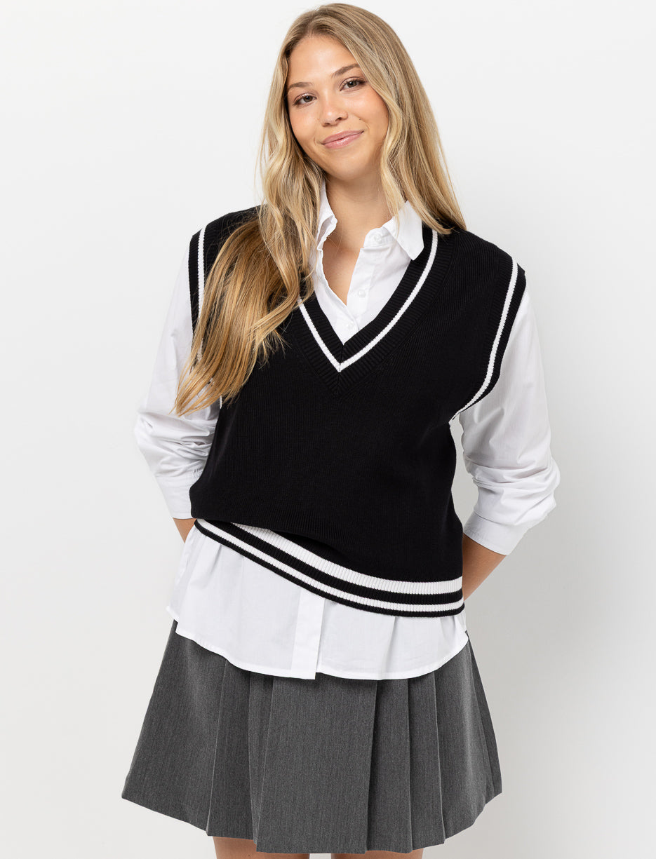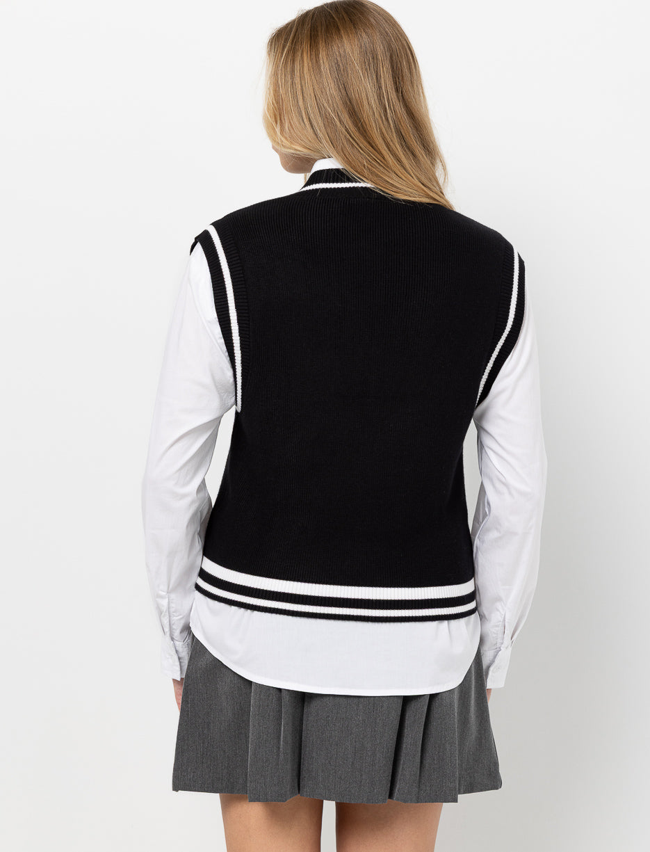 Un chandail sans manches en tricot à rayures contrastantes, parfait pour superposer sur une chemise et créer un look chic et moderne.
