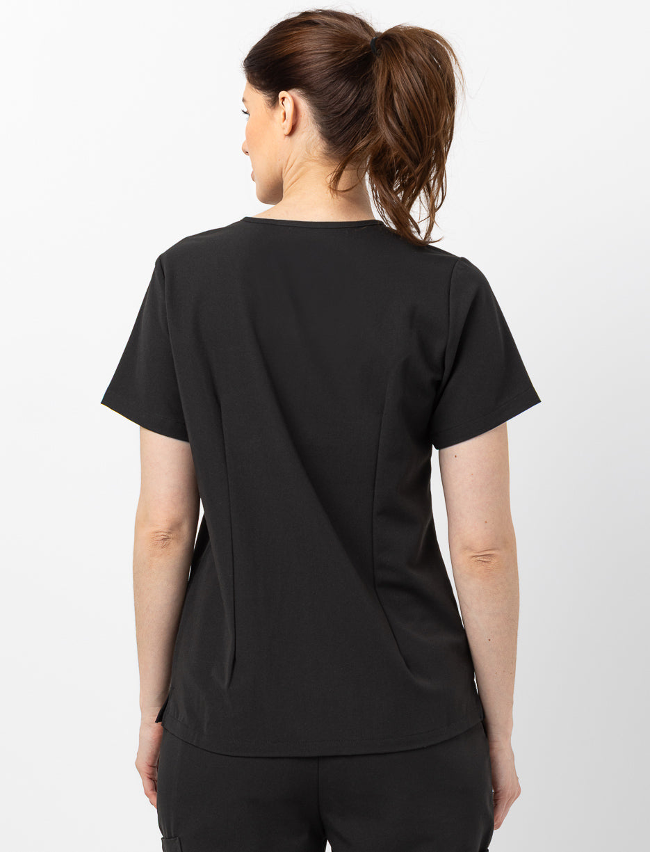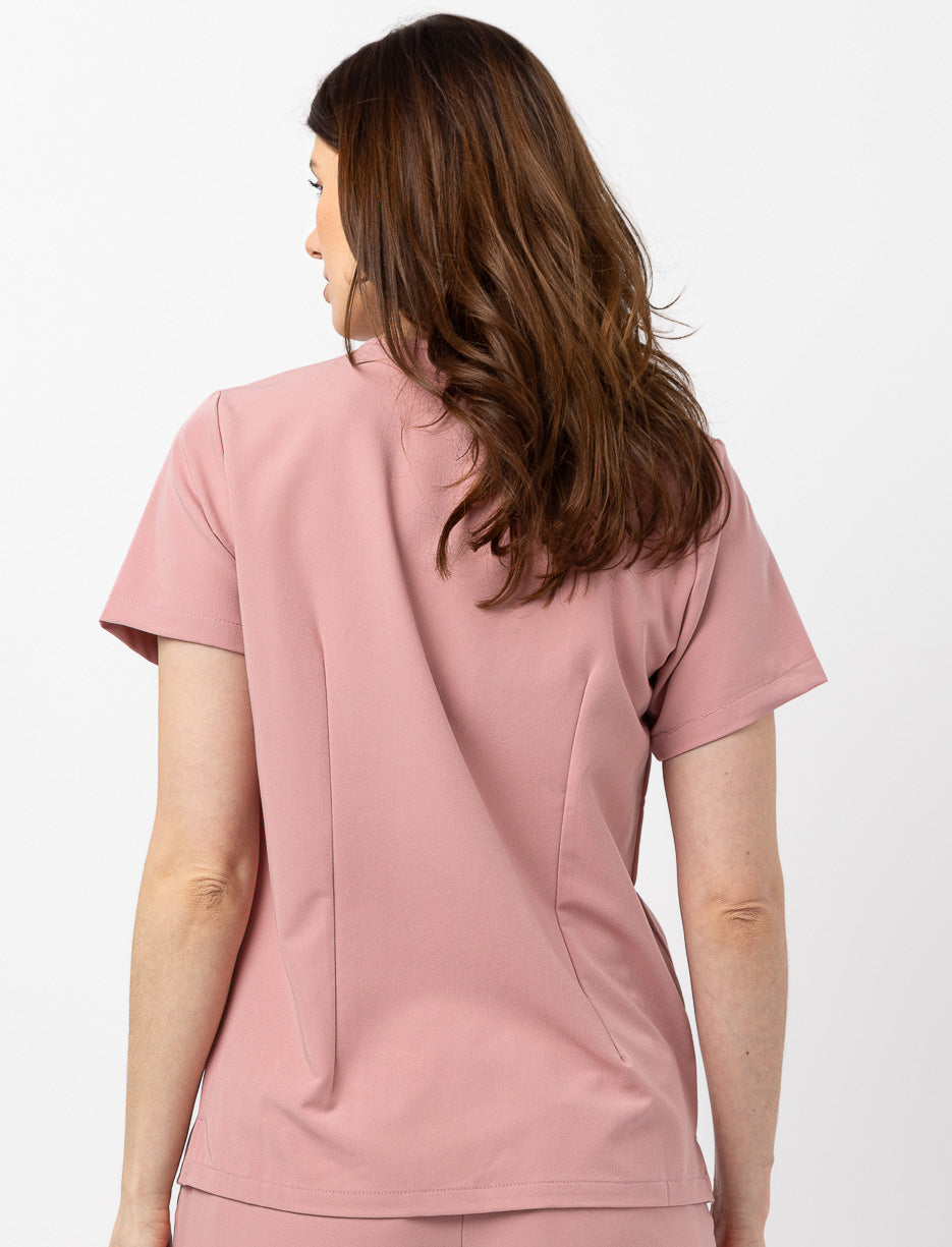 Tunique médicale élégante aux manches courtes avec revers distinctif et col en V épuré. Dotée de poches fonctionnelles au buste et à la taille, ainsi que de fentes latérales au bas pour une mobilité optimale. Confectionnée dans un tissu extensible qui épouse le corps avec grâce tout en offrant le confort nécessaire aux professionnels de la santé. Un incontournable de la garde-robe infirmière moderne.