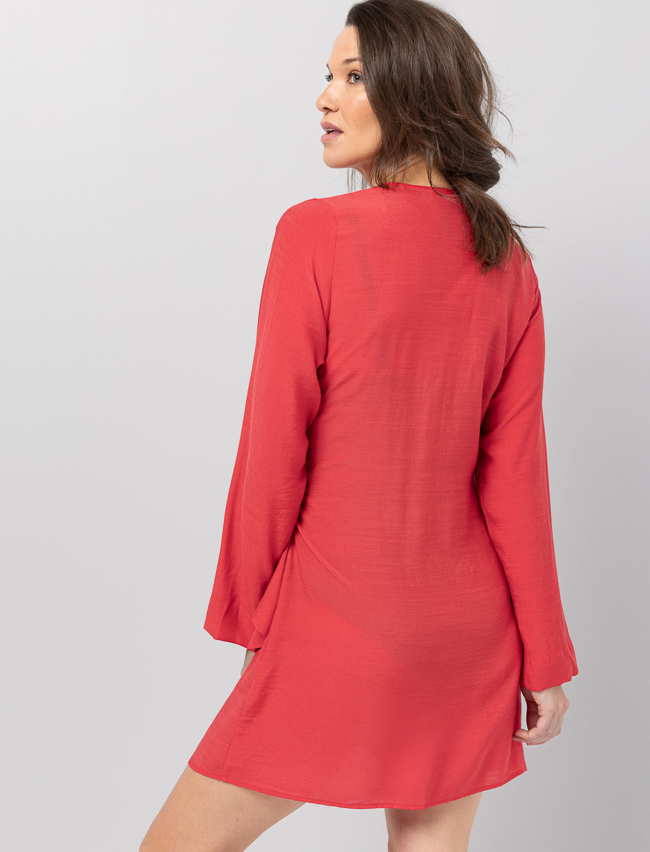 Cette robe cache-cœur en voile s’enfile facilement par-dessus un maillot et crée immédiatement une allure élégante. Son drapé noué met la silhouette en valeur tout en offrant une couverture légère, parfaite pour se déplacer avec style au bord de l’eau.