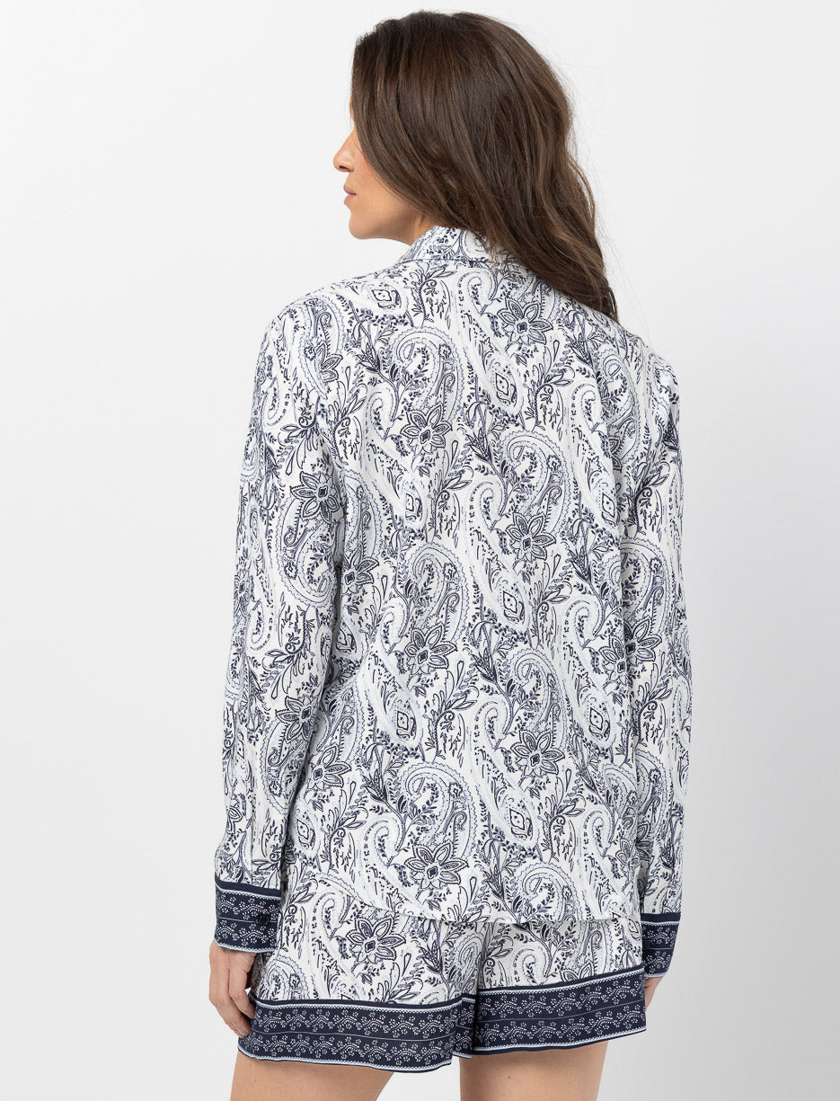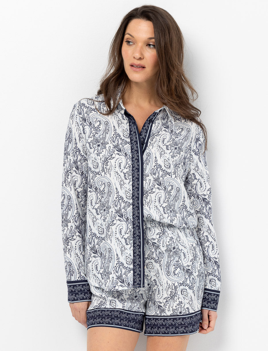 Chemise à manches longues avec col chemisier et fermeture par boutons. Les poignets et boutons contrastants créent un effet visuel amusant, tandis que le motif coloré qui habille l'ensemble donne du caractère à cette pièce incontournable de la garde-robe.