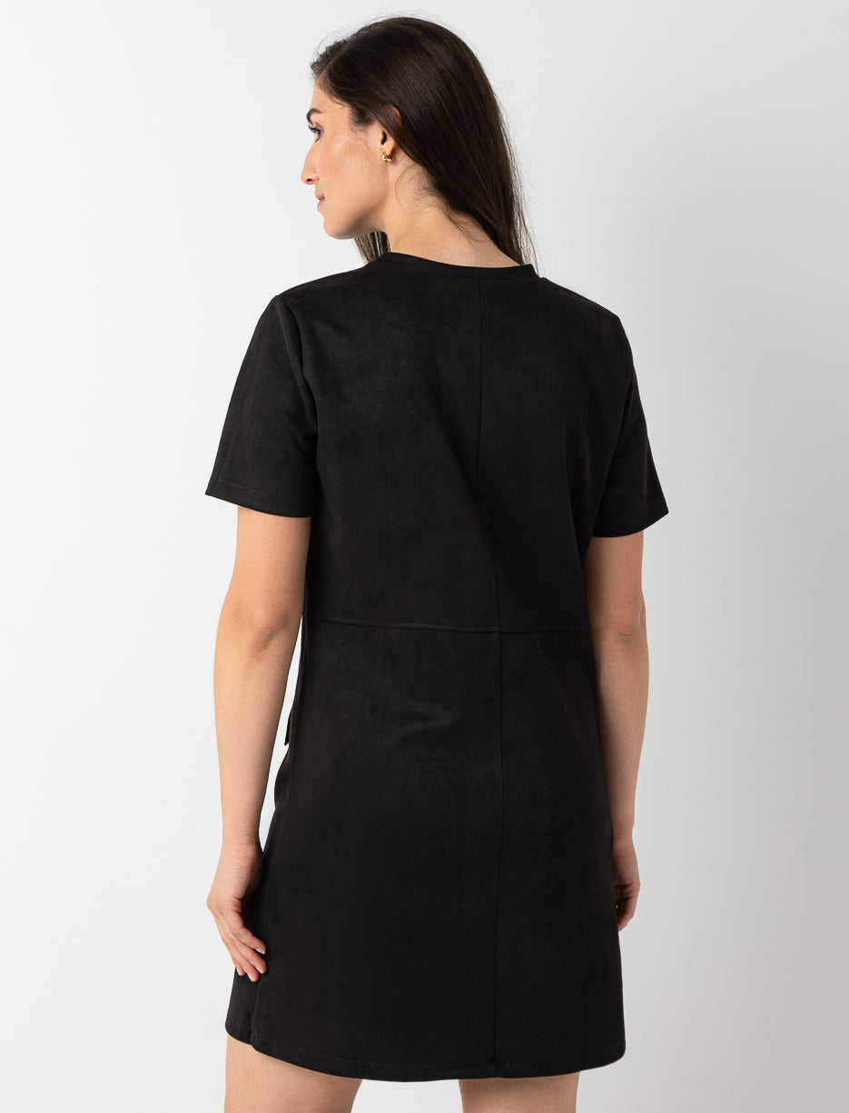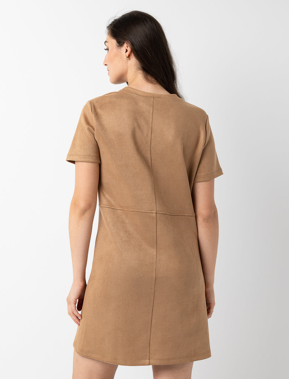Cette robe en faux suède apporte une douceur irrésistible et un petit air rétro, rehaussée de fausses poches à rabat pour un look tout en simplicité.