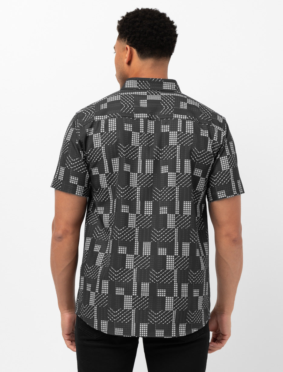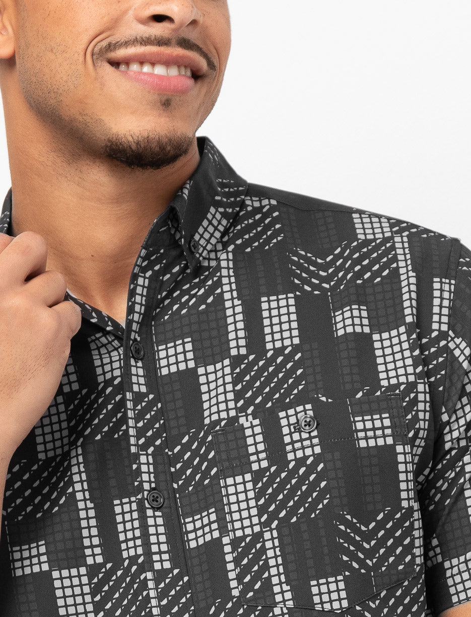 Cette chemise à manches courtes se démarque par son motif graphique qui ajoute du style à vos tenues. Sa coupe confortable et sa poche poitrine pratique en font un choix facile pour les journées chaudes, au quotidien comme en sortie.
