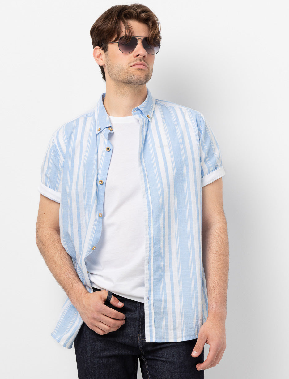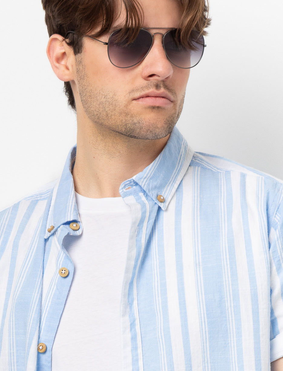 Chemise à effet lin pour homme, à manches courtes, col chemisier et fermeture à boutons. Motif à rayures sur l’ensemble pour un style décontracté.