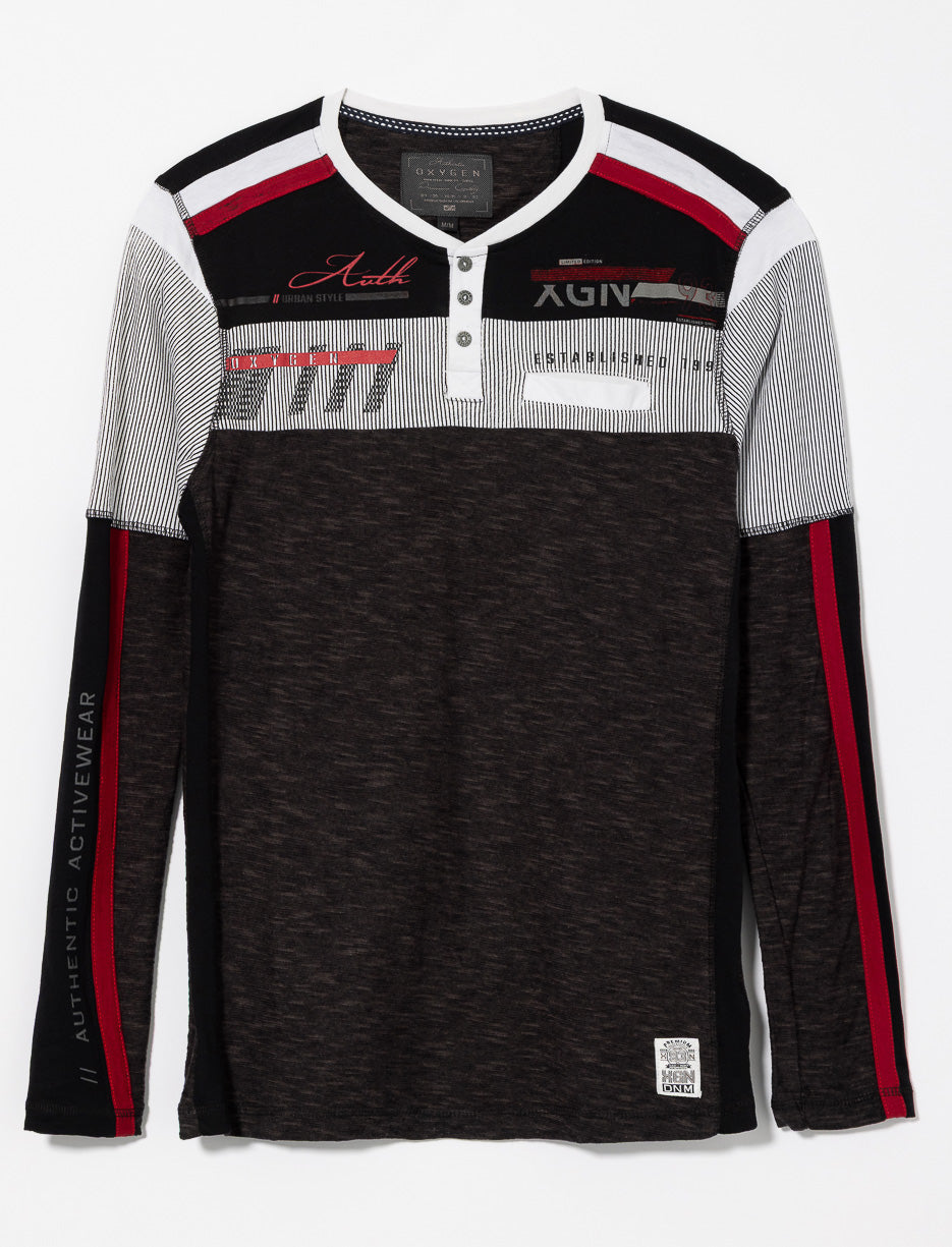 Adoptez un style moderne avec ce t-shirt à manches longues doté d’une encolure boutonnée et de détails contrastants. Profitez d’un design tendance qui allie confort et originalité.