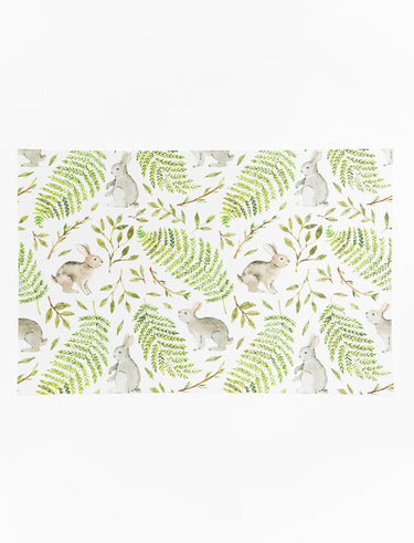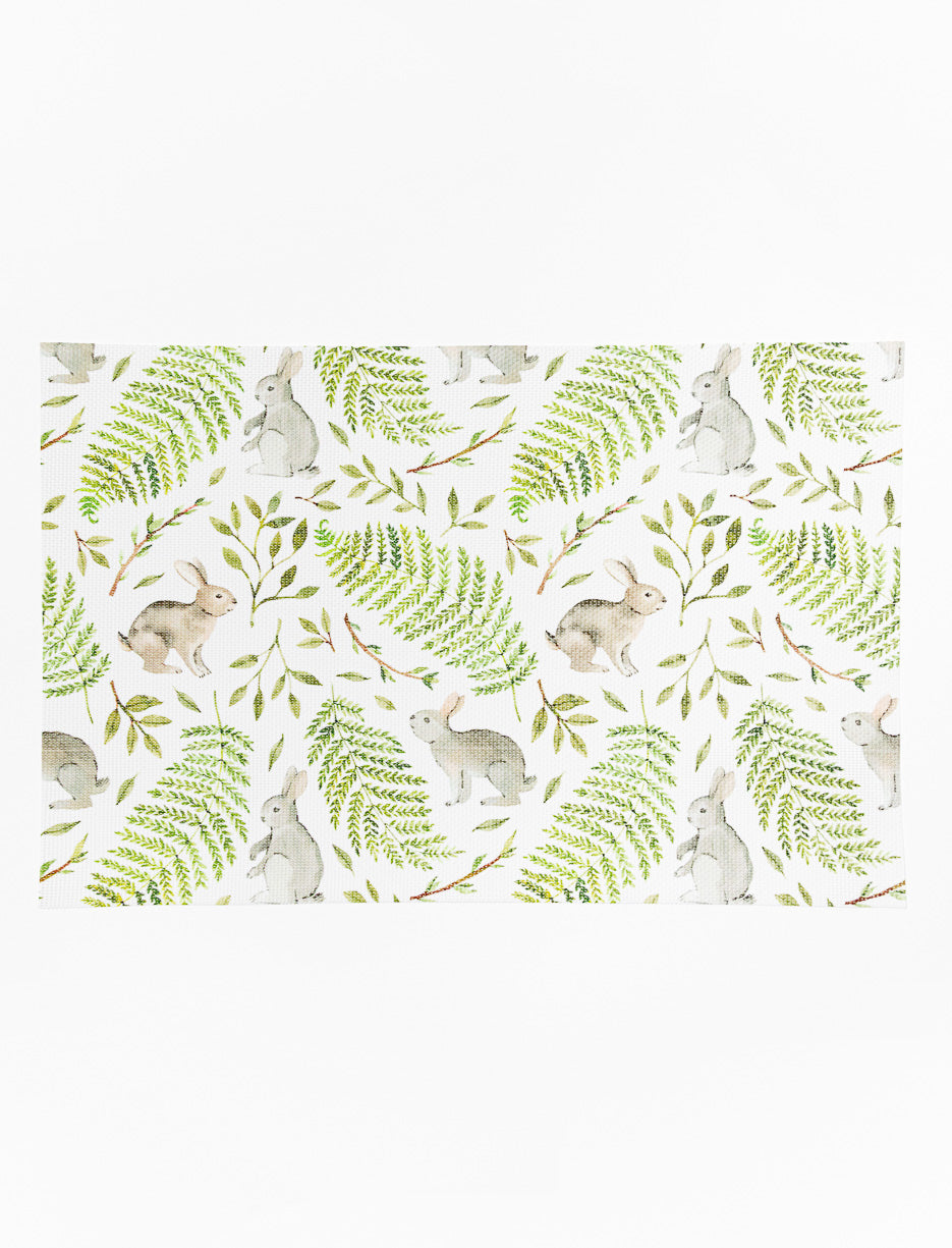 Craquez pour ce napperon à motif de lapins et de feuillage! Adorable, facile à nettoyer et parfait pour ajouter une touche nature à la table. Dimensions : 30 x 45 cm.