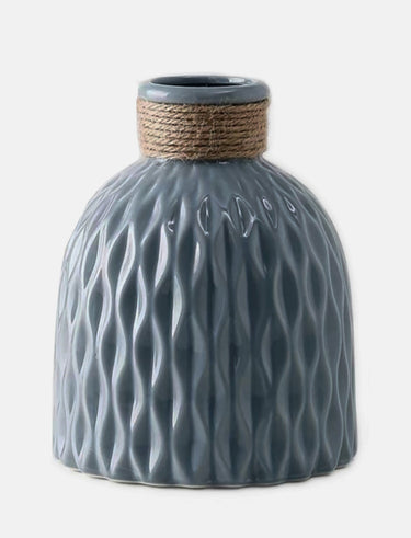 Un vase en grès bleu aux reliefs élégants, rehaussé d’une corde naturelle qui ajoute une touche chaleureuse. Parfait pour accueillir un bouquet ou apporter une note décorative à l’espace. Dimensions : 11,5 x 11,5 x 15 cm.
