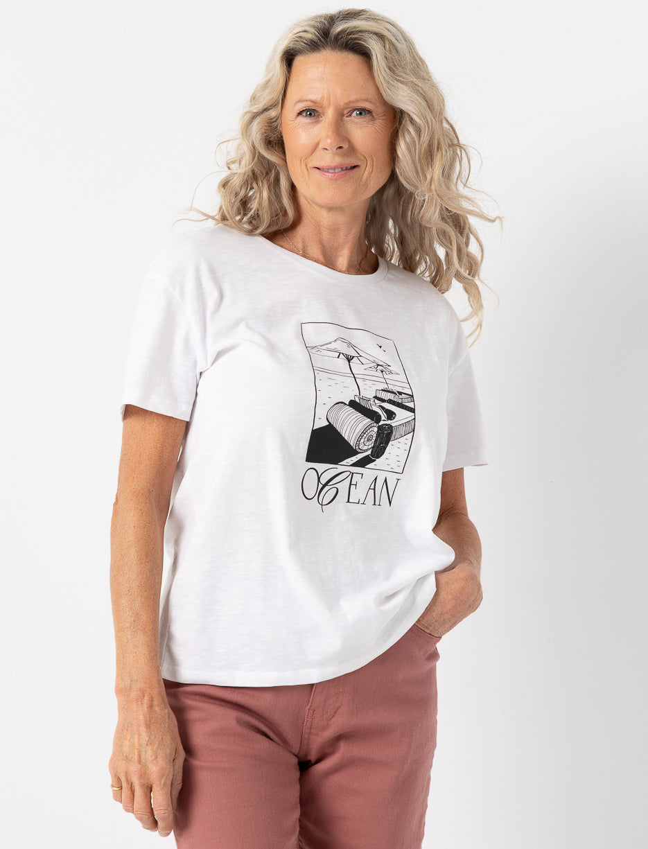 Ce t-shirt imprimé dégage une ambiance estivale dès le premier regard ! Parfait pour relaxer ou profiter du beau temps.