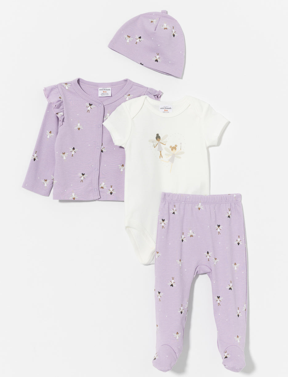 Turn every morning into a fairy tale with this 3-piece set featuring a soft bodysuit, fairy-print pants, a ruffled cardigan, and a matching hat. Comfort and magic combined for your little treasure.