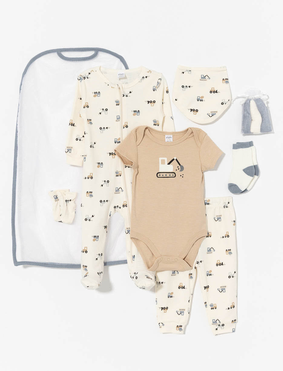 3-piece set with accessories including a zip-up sleeper, a bodysuit, printed pants and practical essentials such as bib, mittens, socks and washcloth.