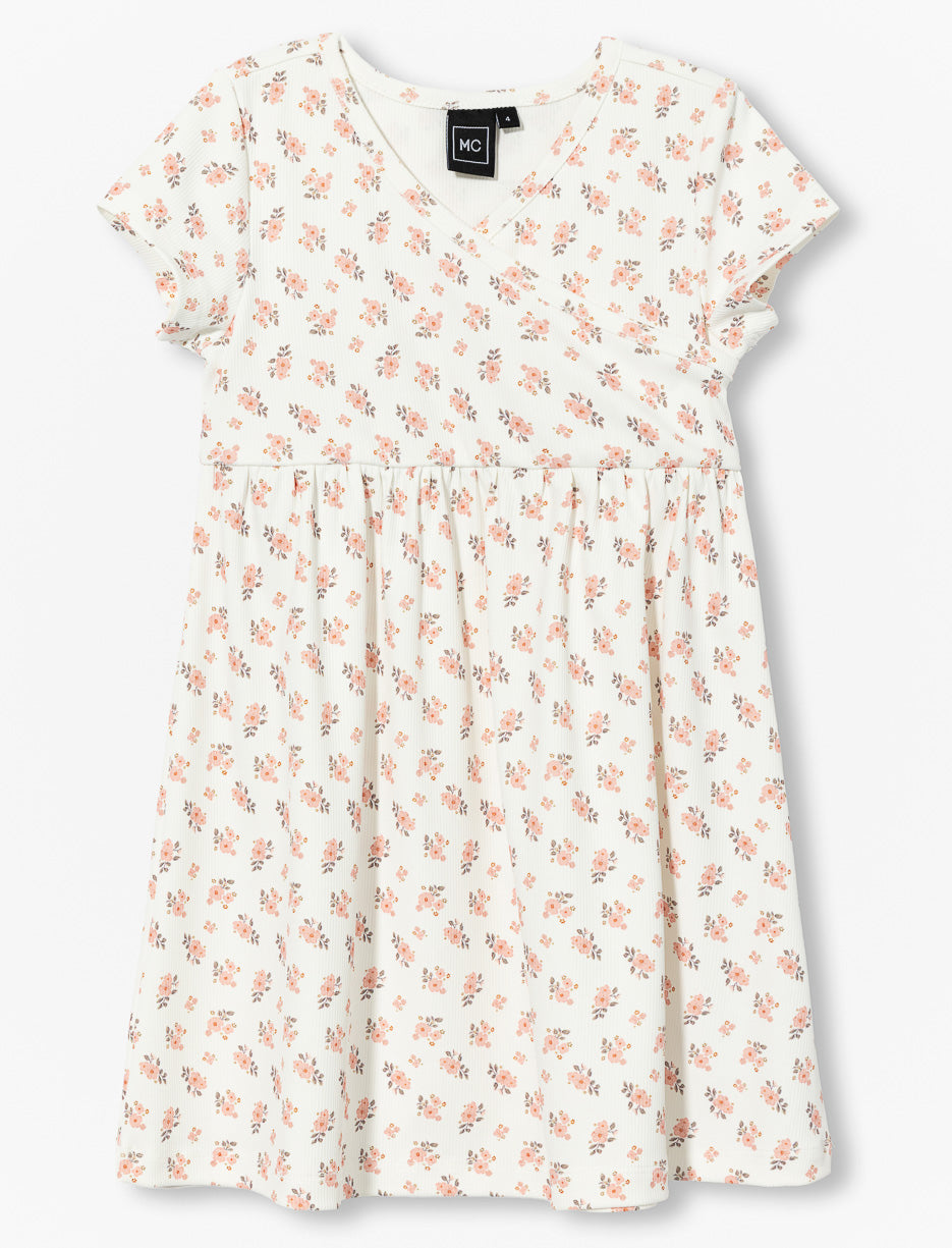 Dress your little girl in this charming short-sleeved dress with a round neck. The delicate floral pattern covers the entire dress, adding a touch of nature and sweetness. The fitted waist and rounded hem provide optimal comfort for your baby's day.