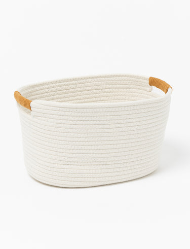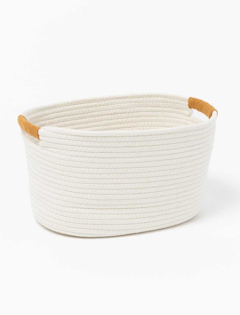 White cotton rope basket with contrast handles. Medium size, ideal for stylish storage or decoration. Dimensions: 15.75" x 11.8" x 7.9"h.