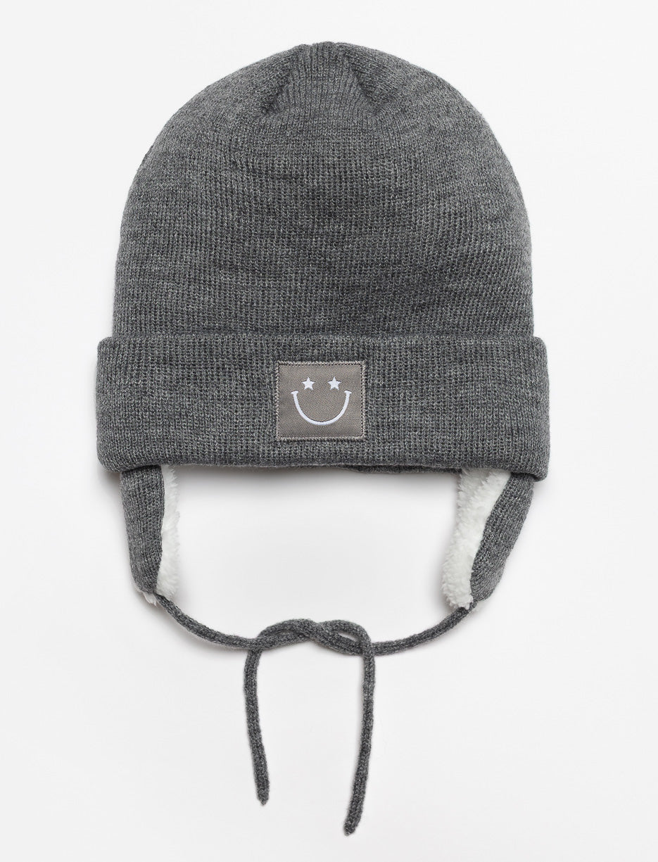 Keep your little boy cozy with this knitted beanie featuring a cuff and a smiley patch. A practical and fun accessory that brings warmth and joy to chilly days.