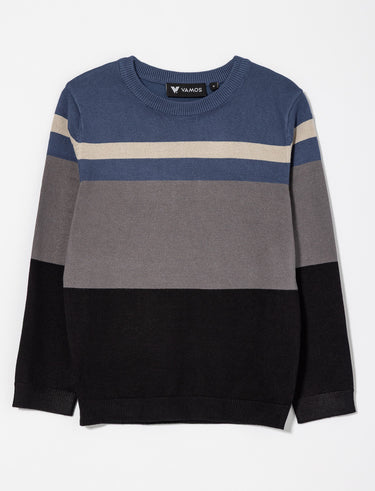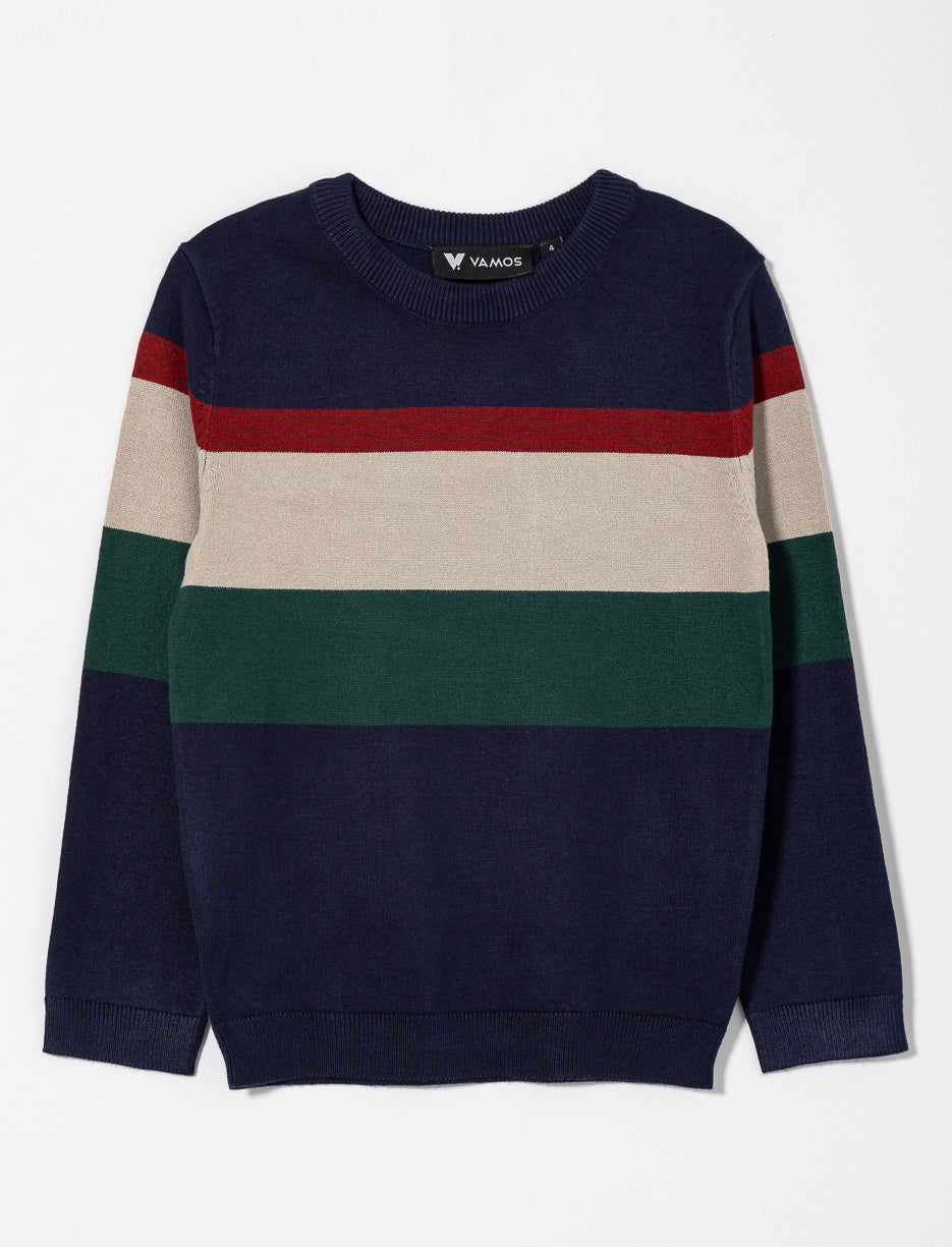 This striped knit sweater is a practical and stylish choice. Comfortable and easy to pair, it’s perfect for school or casual outings.