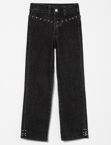 These straight-leg jeans are accented with rhinestones at the waist and ankles, adding a subtle touch of sparkle to everyday looks. Perfect for a hint of shine.