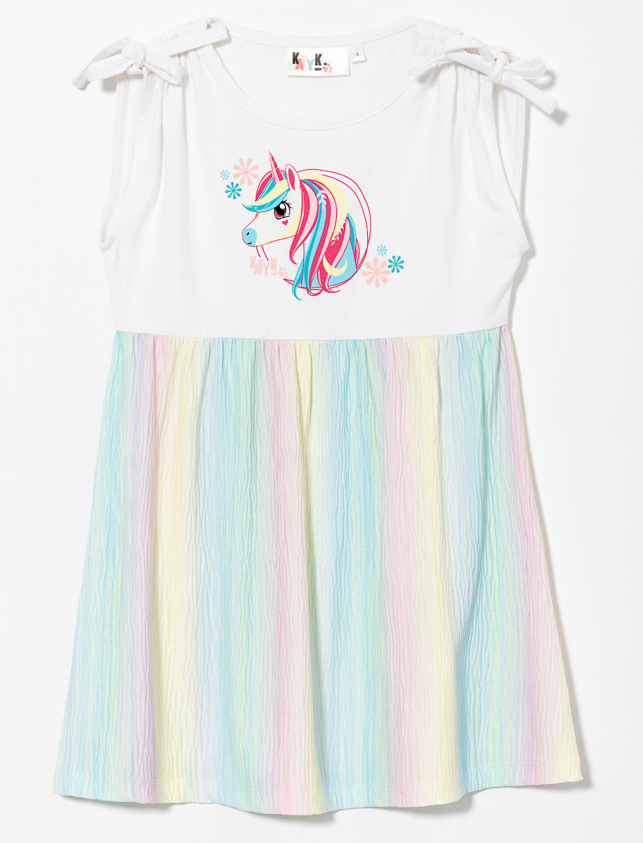 The perfect sleeveless dress for little girls who love to play! Featuring a classic round neckline and adjustable shoulder ties, it offers a comfortable, personalized fit. The playful front print adds a touch of fun and colour. Ideal for school days, family outings, or outdoor play, this dress combines style and practicality.