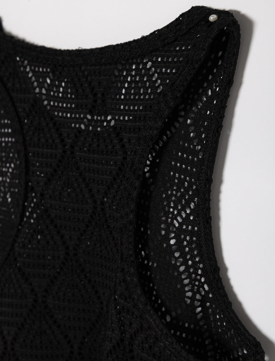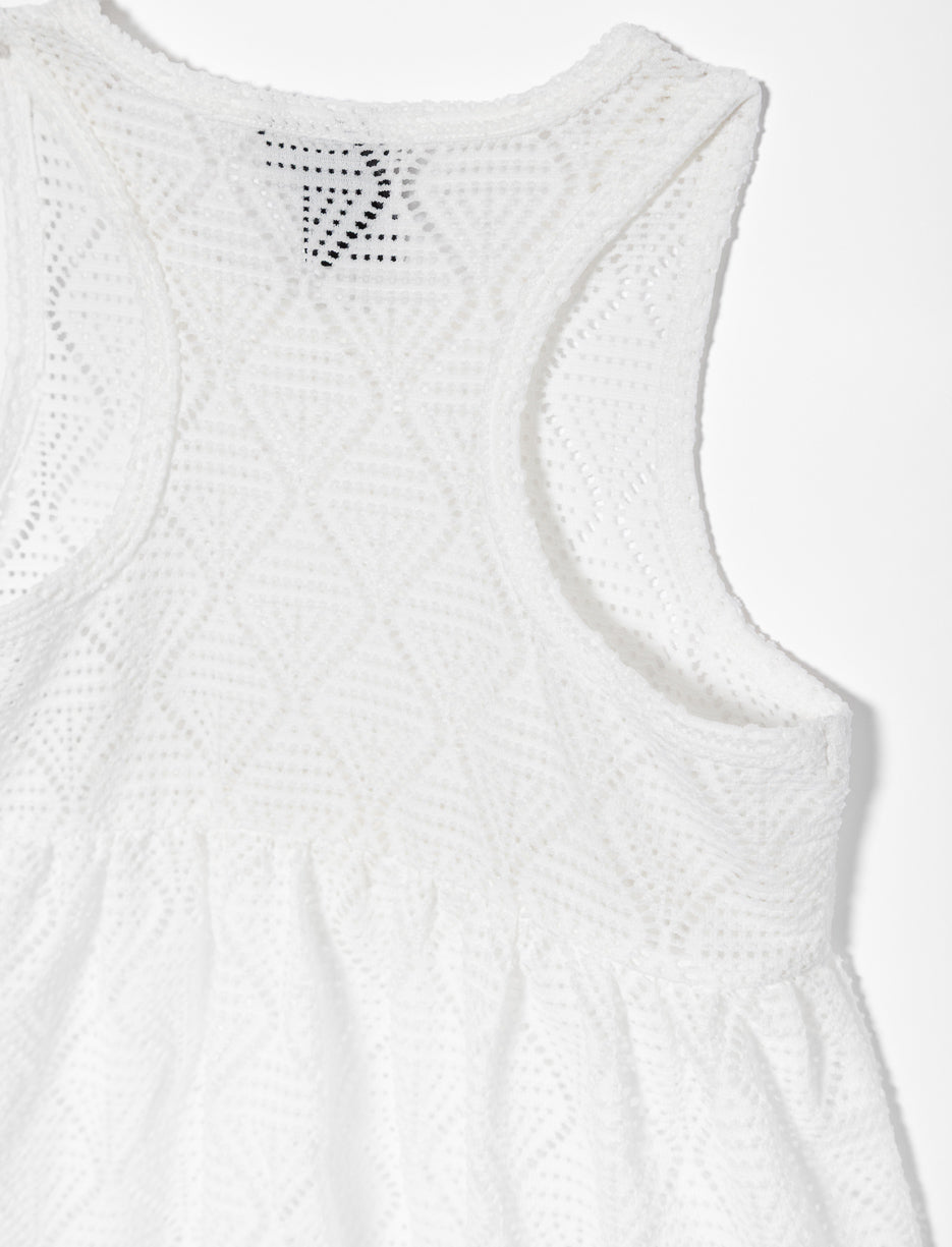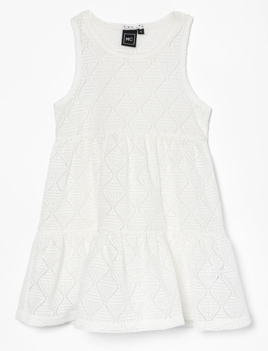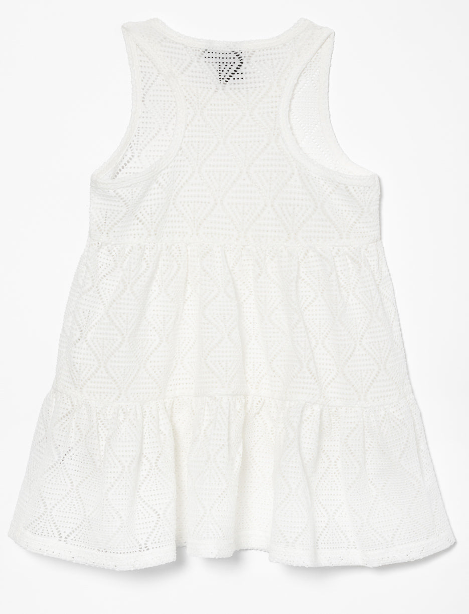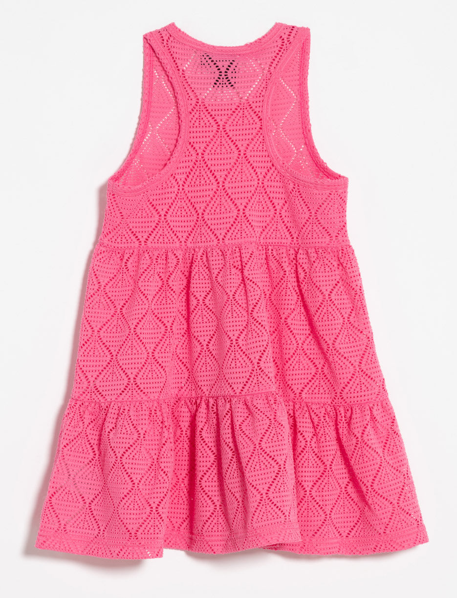 Brighten up her summer wardrobe with this adorable pink beach dress. Featuring a delicate crochet design and a breezy, tiered silhouette, it’s perfect for sunny days by the shore.