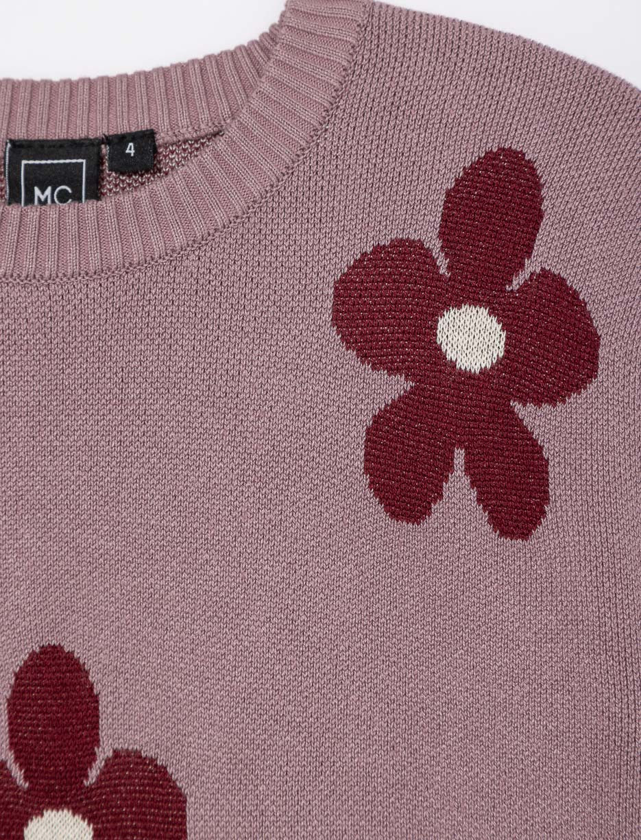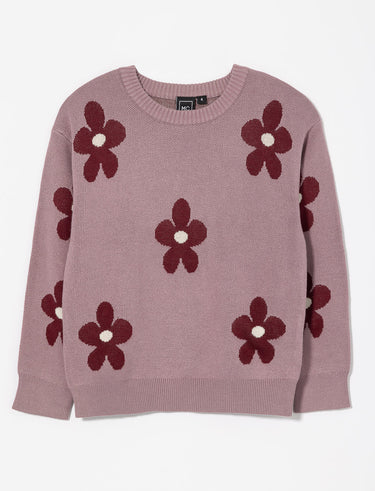 A soft knit sweater with long sleeves and dropped shoulders. Its round neck and delicate flowers bring cozy charm to cool days.