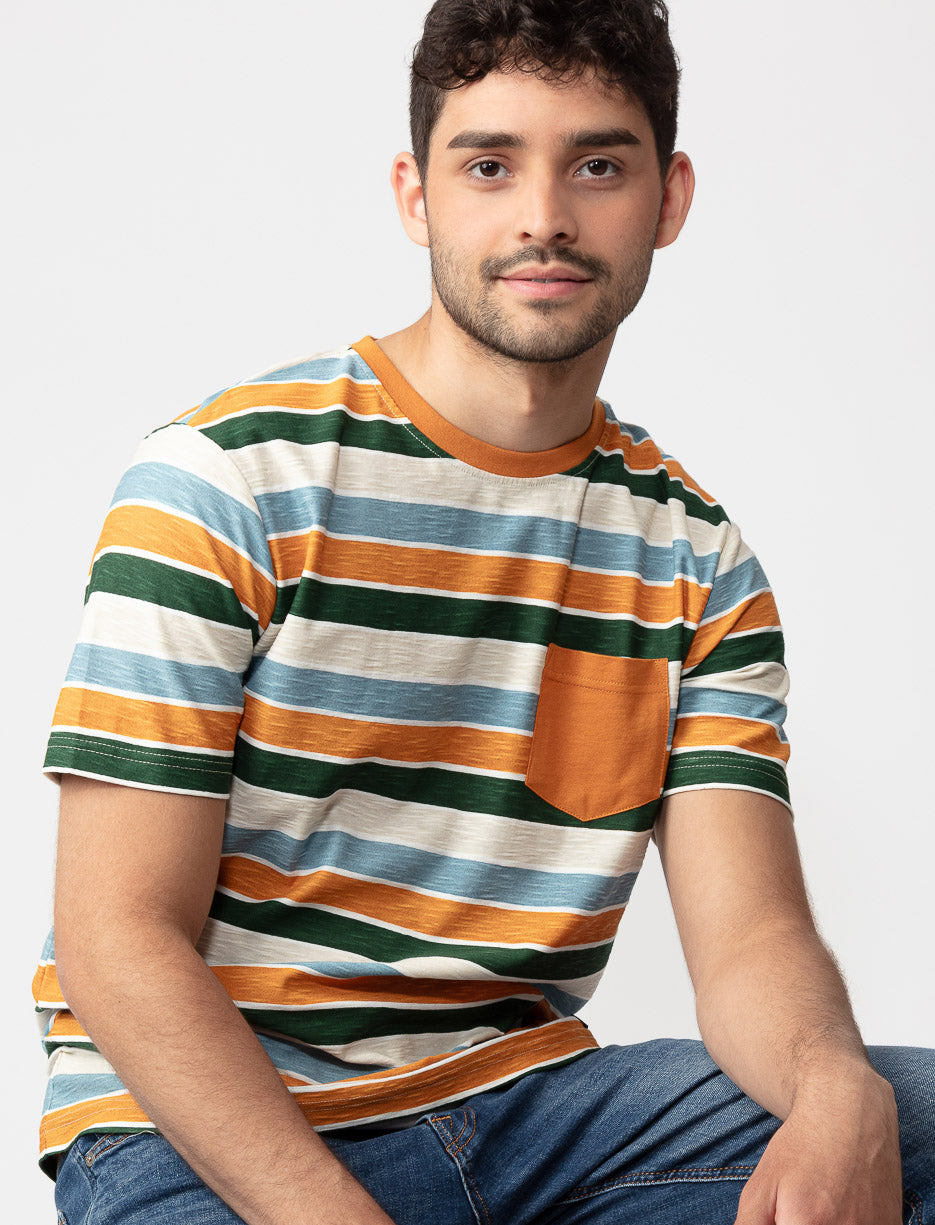 Add a splash of autumn to your wardrobe with this effortlessly stylish striped tee. Featuring classic, nature-inspired hues and a discrete pocket, it's your go-to for a relaxed yet put-together look.