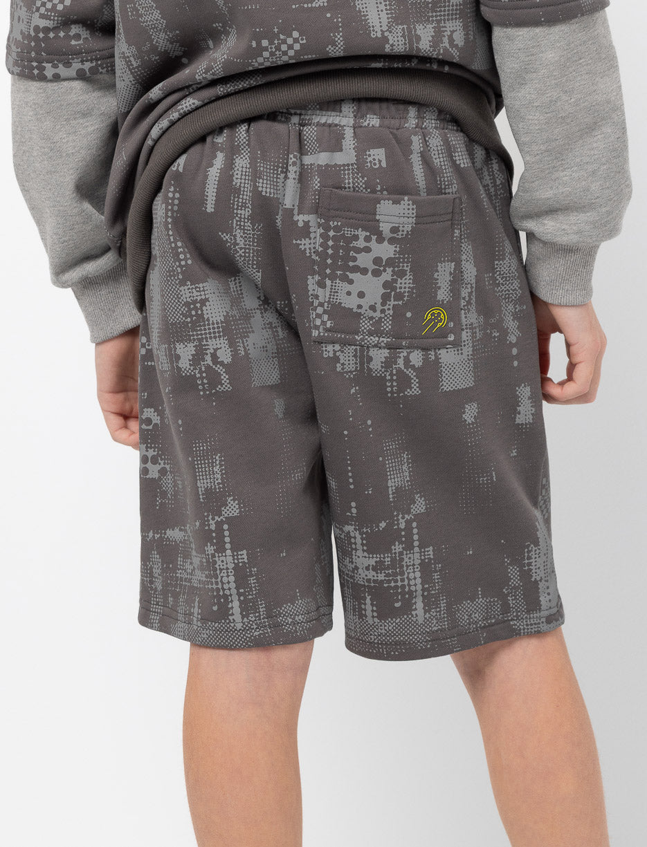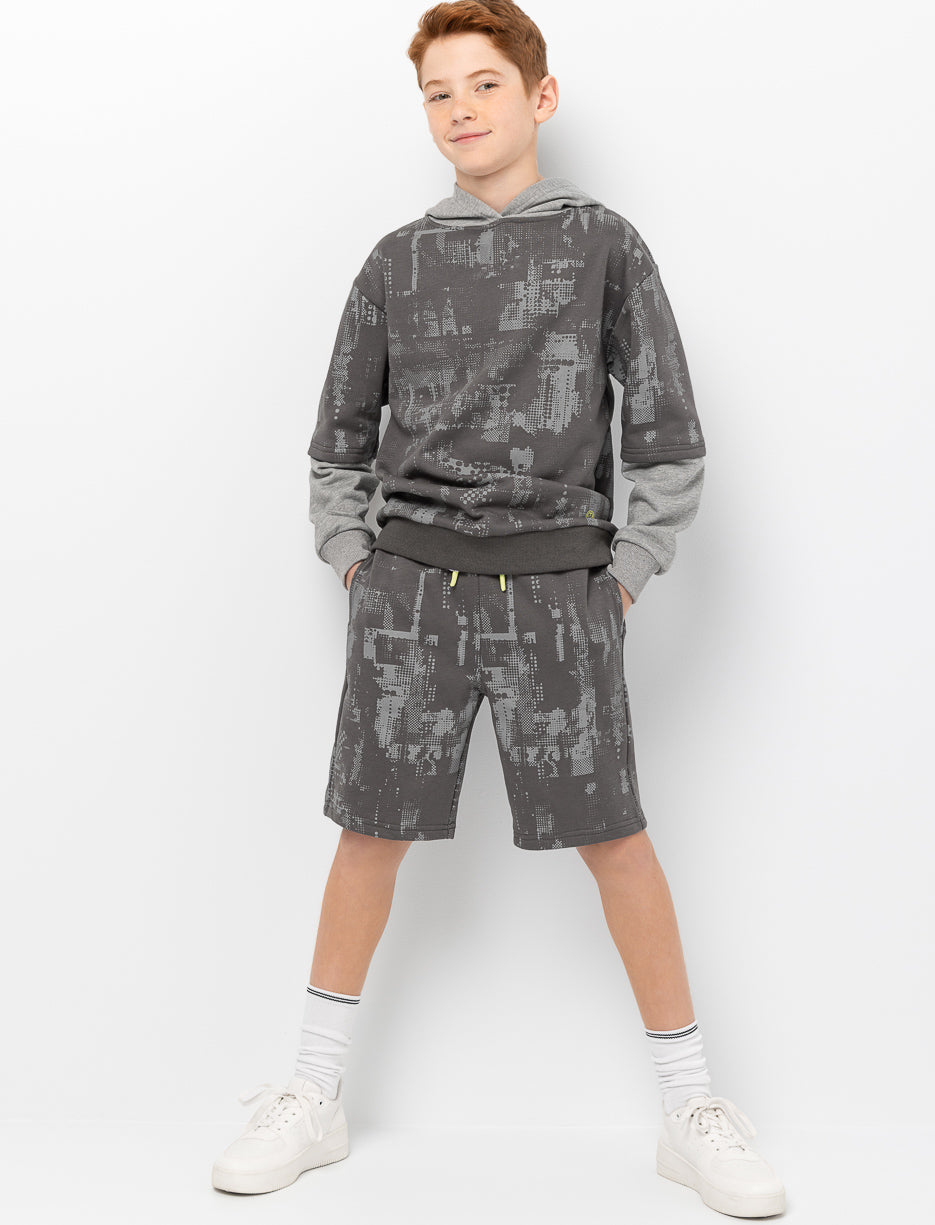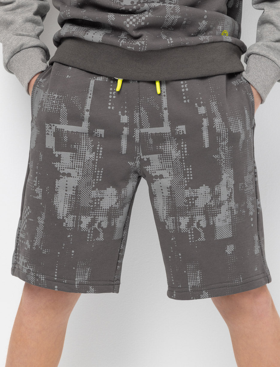 These boys' shorts combine comfort and style. They feature an elasticated waistband with an adjustable drawstring, two convenient side pockets, and a back pocket. A vibrant pattern adorns the entire garment for a relaxed and trendy look.