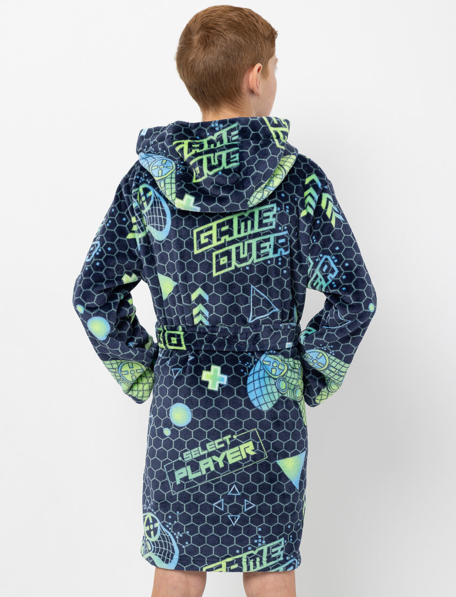 Wrap your boy in cozy comfort with this plush bathrobe featuring a hood. Designed with a practical belt and handy pockets, it’s perfect for relaxing at home while enjoying the fun gamer print.
