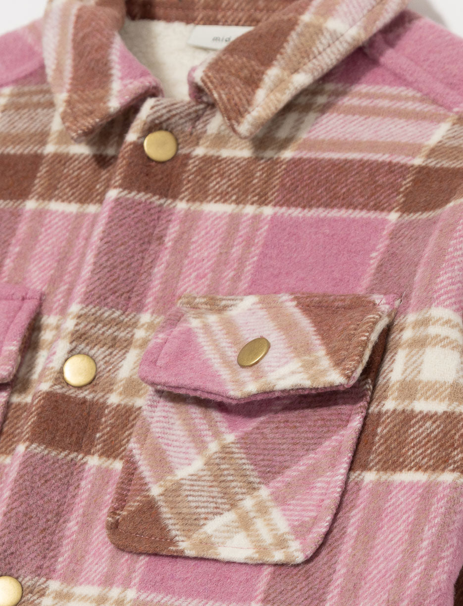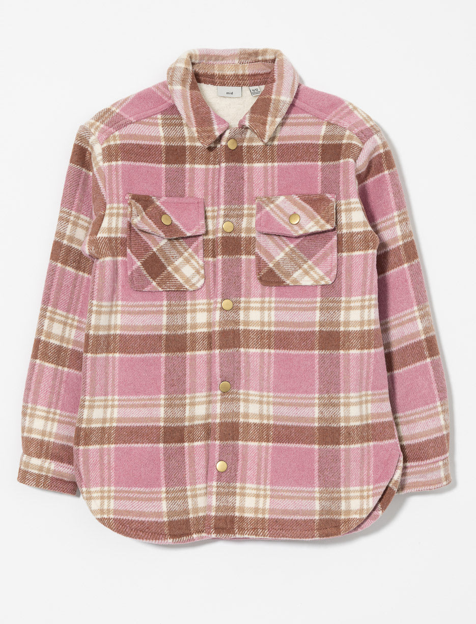 Trendy lined overshirt for teen girls with a plaid print, flap pockets, and button closure. Ideal for layering and adding style and warmth to any casual outfit.