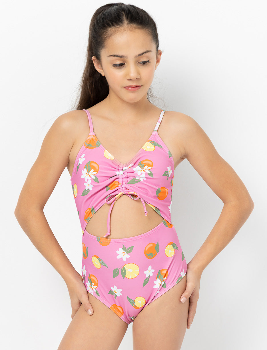 This printed 1-piece swimsuit is both cute and functional! The drawstring detail creates a ruched effect at the bust, while adjustable straps ensure the perfect fit. UV50 protection keeps her safe for carefree sunny days.