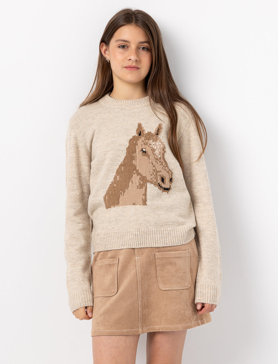 This knit sweater with a horse design adds a unique, cozy touch, perfect for creating a flawless fall look.