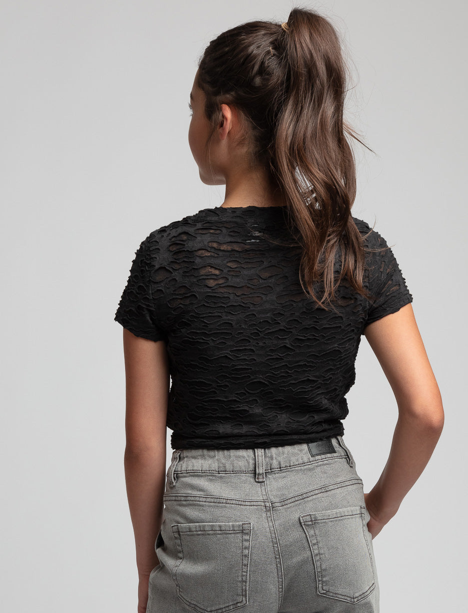 Perfect for the fashion-forward teen, this black crop top brings an edgy vibe to any ensemble. Its unique texture makes it a standout piece, ideal for mixing and matching with her favorite jeans or skirts.