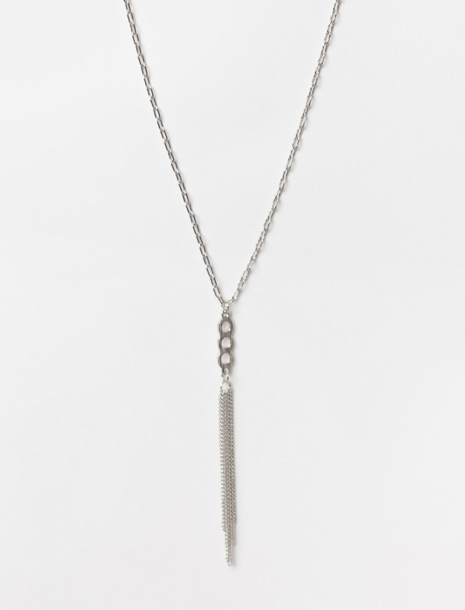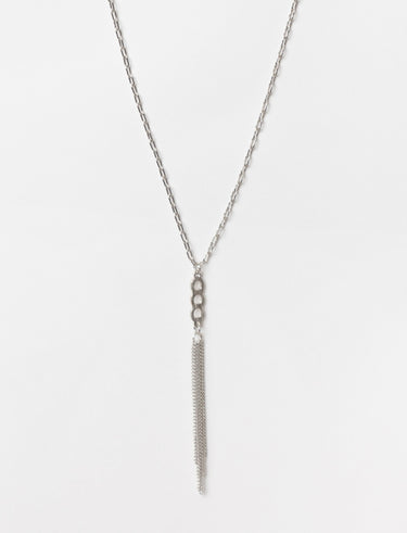 Elevate your outfit with this chic necklace featuring a unique chain-link pendant and cascading tassel detail. Its sleek design adds a touch of modern elegance, making it the perfect accessory for both casual and formal occasions.