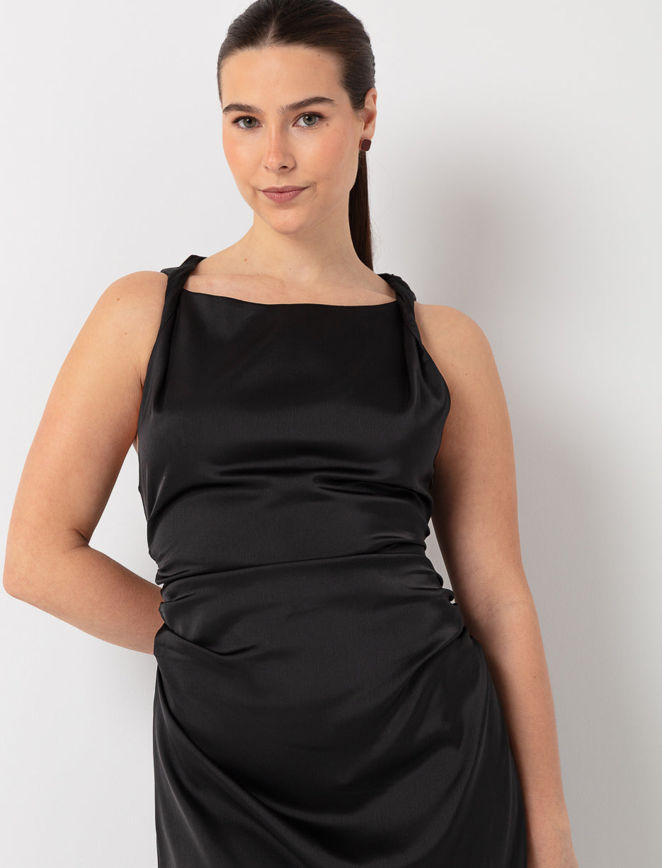 A satin midi dress with delicate pleats that accentuate the waist. Fluid, feminine and refined, perfect for any dressy occasion.